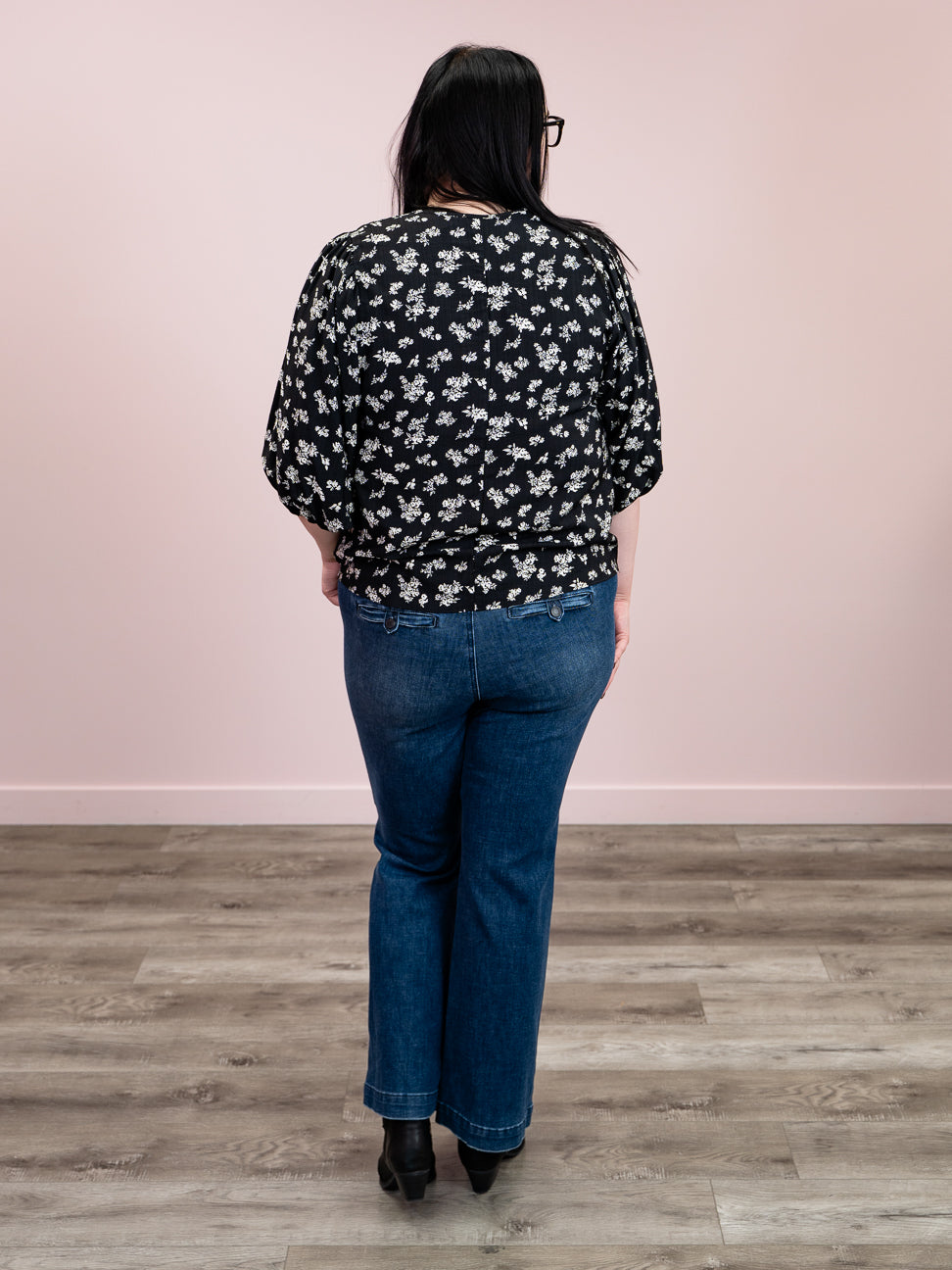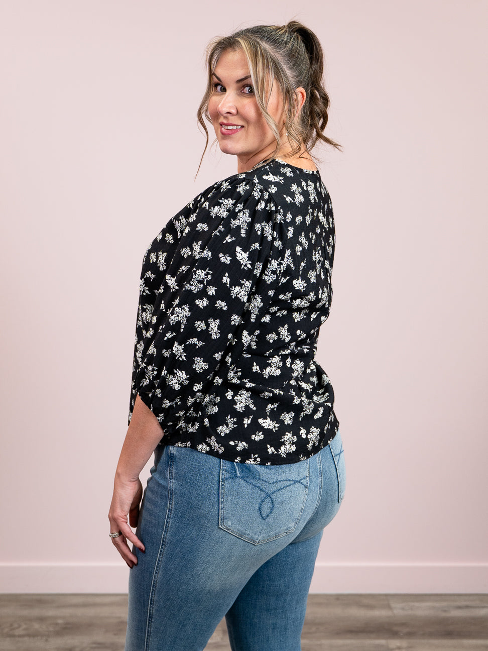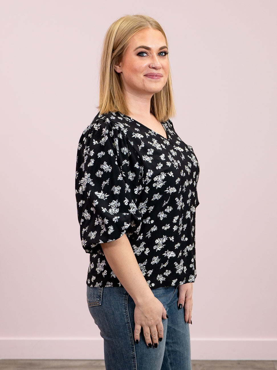 The Taylee Floral Top features a flattering V-neck and charming 3/4 puff sleeves with elastic cuffs for a fun, comfy fit. The lightweight fabric keeps you cool while the delicate floral design adds a touch of whimsy to any outfit. Perfect for brightening up your day with easy, breezy style!