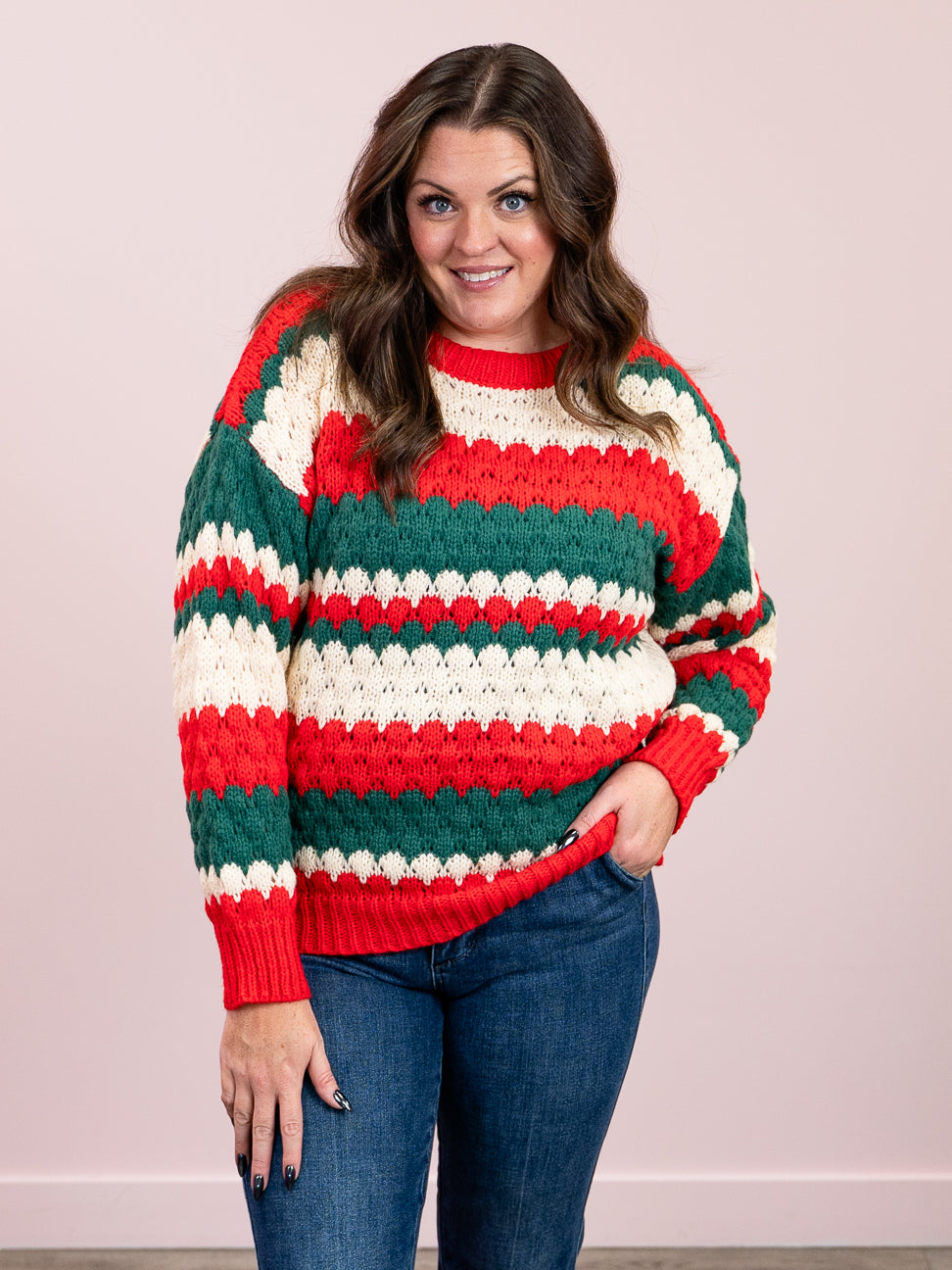 Snuggle up in our Christmas Stripes Sweater and let the holiday fun begin! These playful stripes dance in an almost chevron pattern, bringing cheer to chilly days. Deliciously thick and cozy, it's like wearing a warm hug that keeps Jack Frost from nipping at your nose. Perfect for decking the halls or lounging by the fire with hot cocoa! Festive colors of red, green and tan!