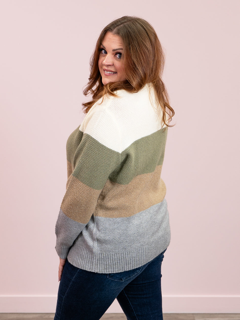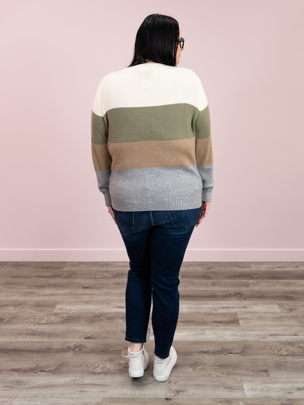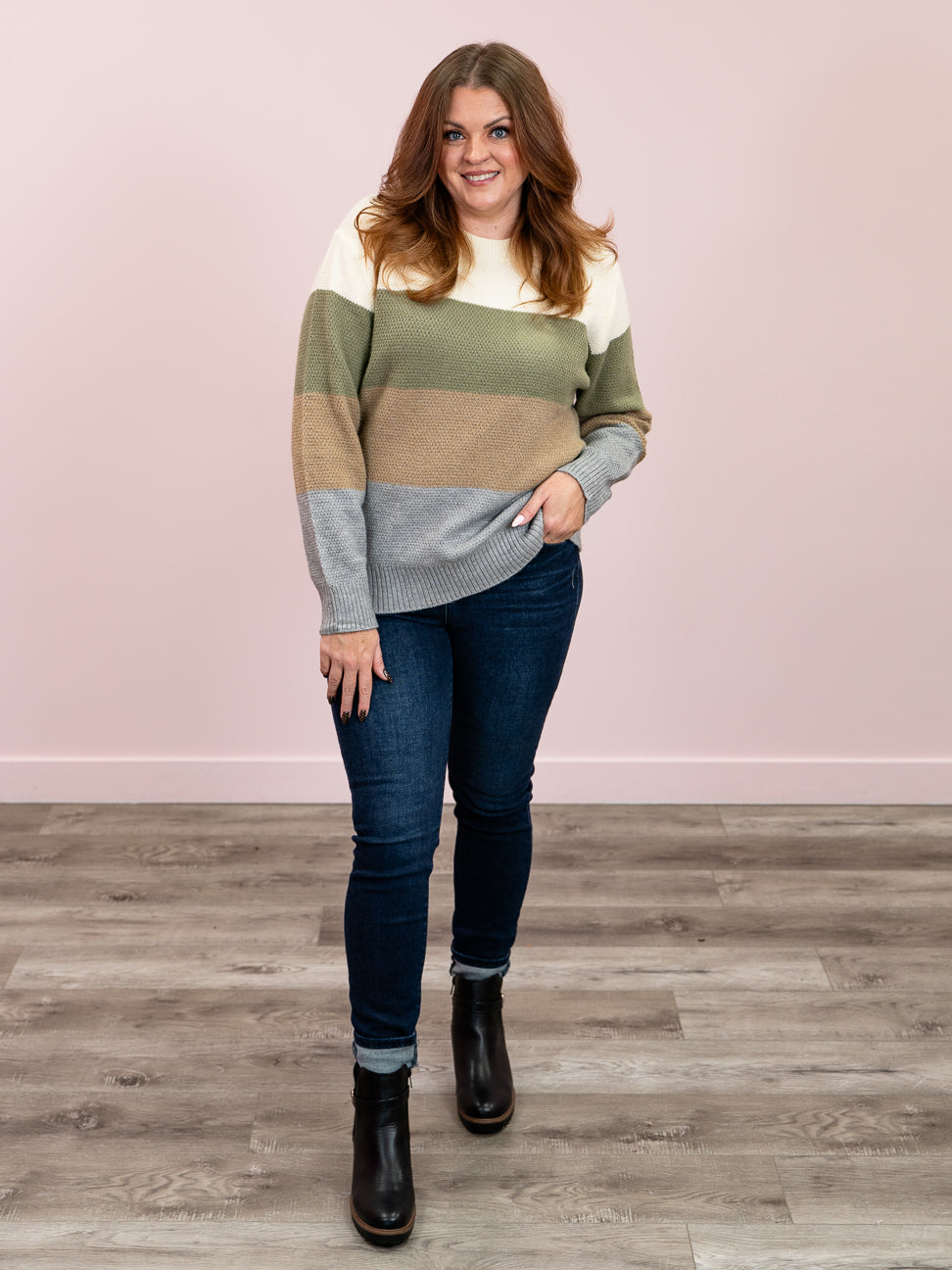 The Colorblock Sweater features a round neck, dropped shoulders, and long sleeves with ribbed trim. Made from cozy waffle material, its relaxed fit is highlighted by a bold colorblock stripe design.
