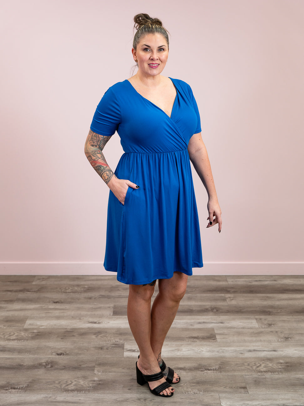 Introducing the First Kiss Dress! This dress features a deep V neck, wrap front, and short sleeves, providing a flattering and comfortable fit. The elastic waist and pockets add convenience and functionality. Made from a soft and stretchy material, this dress is perfect for any occasion. Upgrade your wardrobe with this must-have piece!