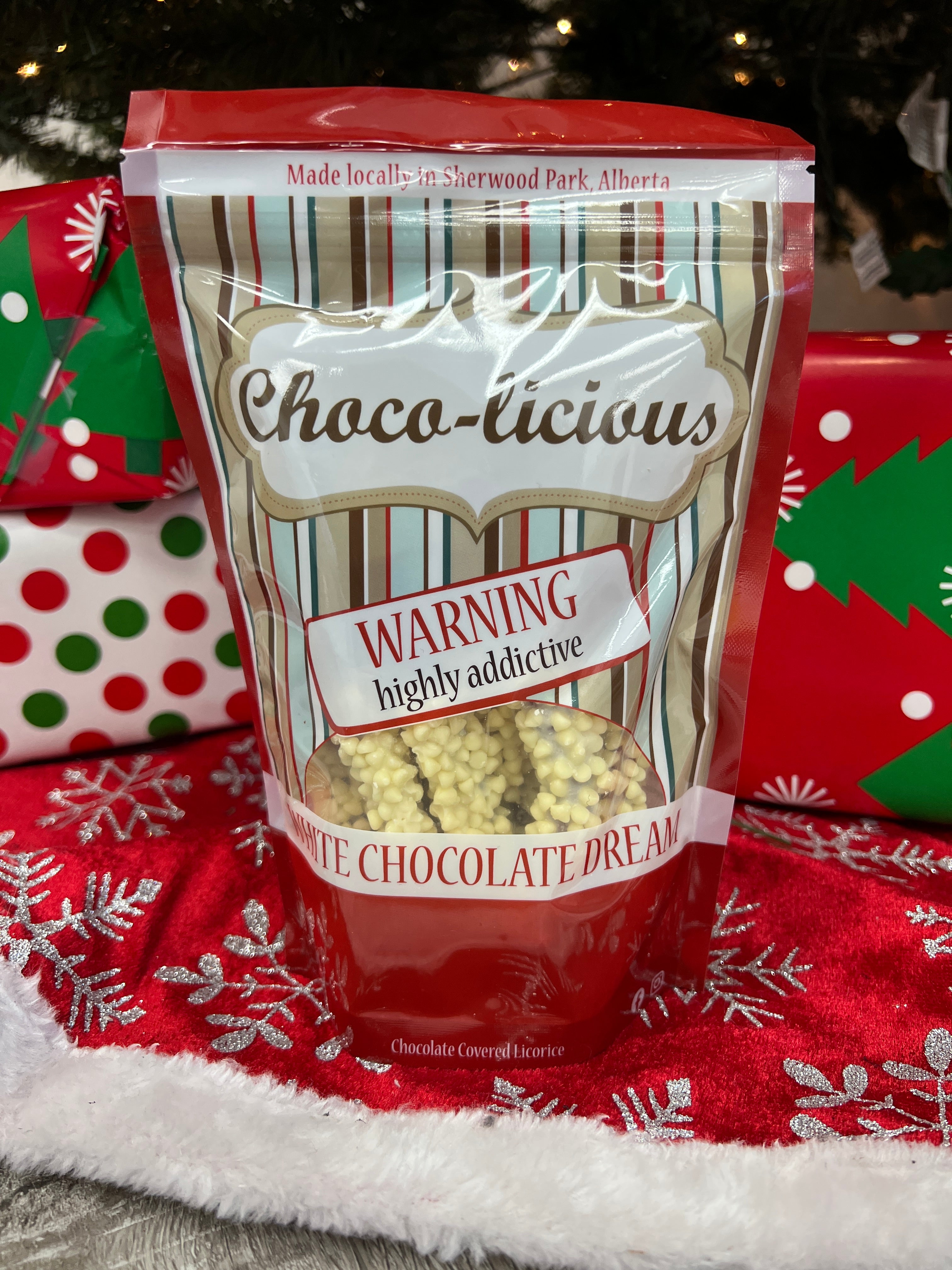 - White Chocolate Dream - Red licorice enrobed with White Chocolate with an extra splash of White Chocolate drizzle.