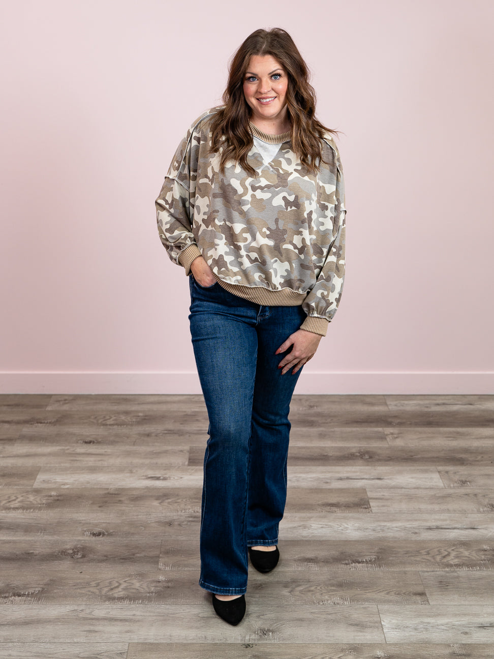 Effortlessly chic meets playfully bold with this Meant To Be Pullover. The camo catches eyes, round neckline with a V-patch detail, exposed seams for an edgy vibe, and charcoal trim along the hemline, cuffs, and neckline complete the look. A versatile piece that proves stripes are always in style.