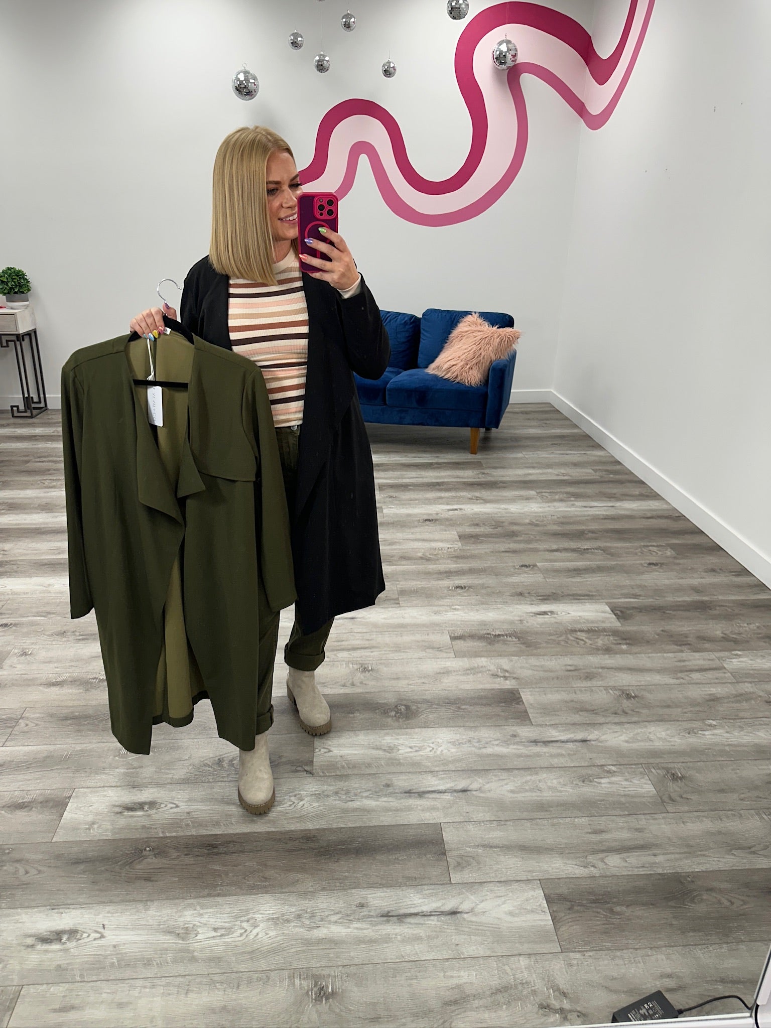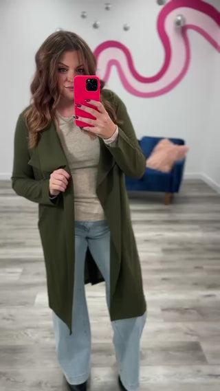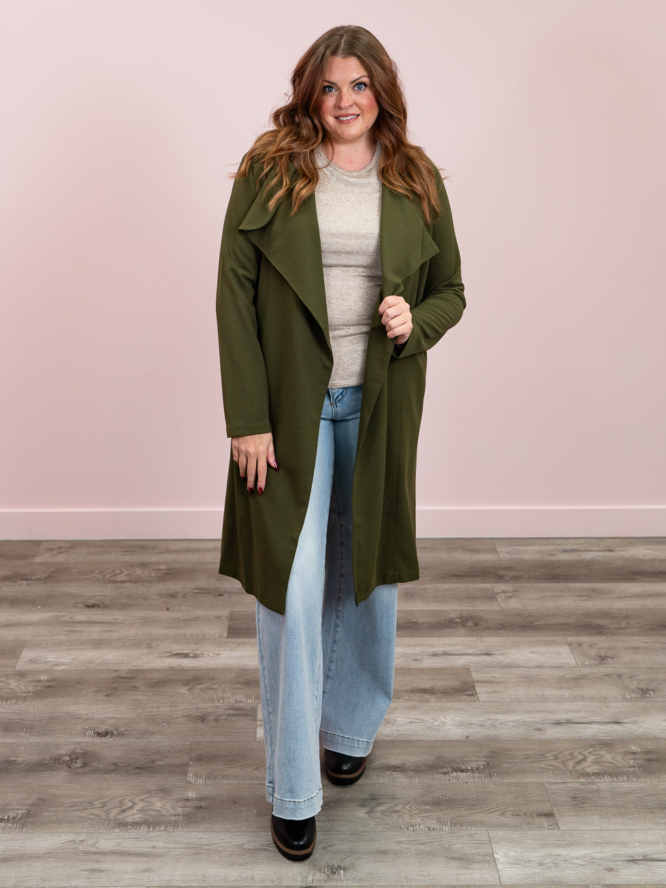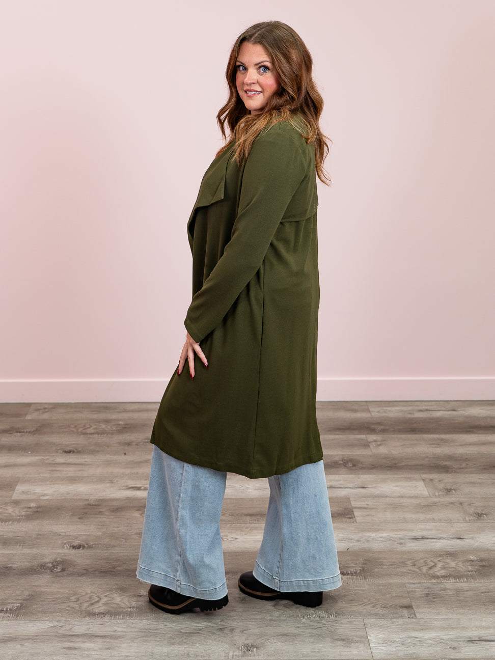 Lightweight and effortlessly stylish, the Roseanne Coat features an open front, side pockets, and a back slit for ease of movement. Its mid-length silhouette makes it perfect for layering through changing seasons.