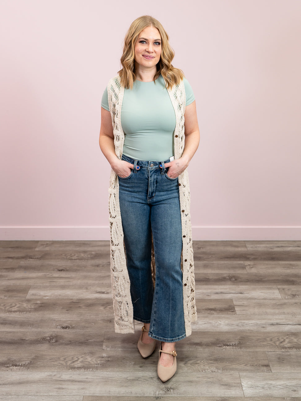 Effortlessly chic meets cozy comfort with the Amelie Sleeveless Long Knit Cardigan. This beige beauty features delicate crochet detailing and a flattering V-neckline that pairs perfectly with everything in your wardrobe. The full button closure makes layering a breeze, while the ankle-length silhouette adds an elegant touch to casual outfits. Throw it on over a dress, tee, or tank for instant sophistication—no sleeves required!