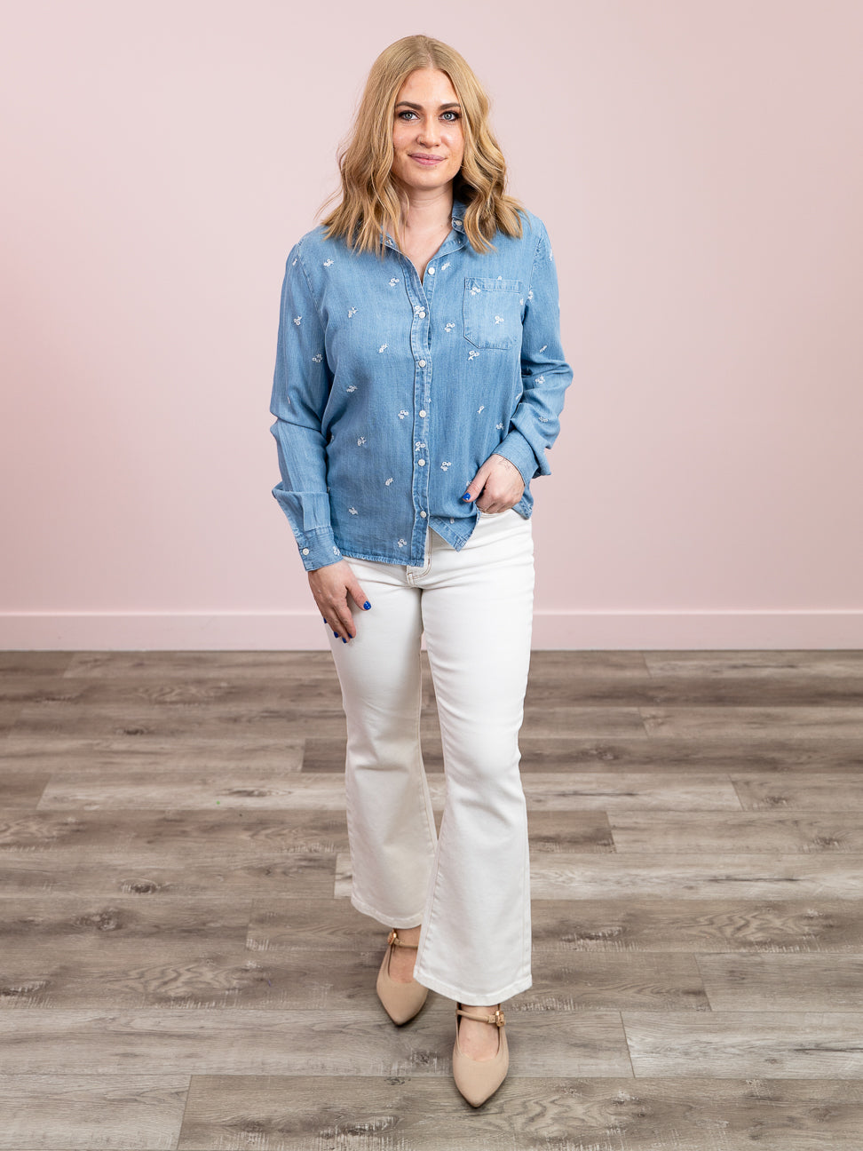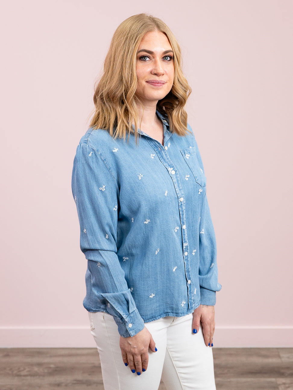 Elevate your everyday style with this charming button-front shirt, featuring delicate embroidery that adds a touch of whimsy to classic design. The crisp collar and lightweight fabric make it perfect for layering or wearing solo, while buttoned cuffs offer a polished finish. Available in a gorgeous medium blue wash paired with white petal accents, this versatile piece transitions seamlessly from casual days to dressed-up occasions. A wardrobe essential that's as fun to wear as it is flattering.