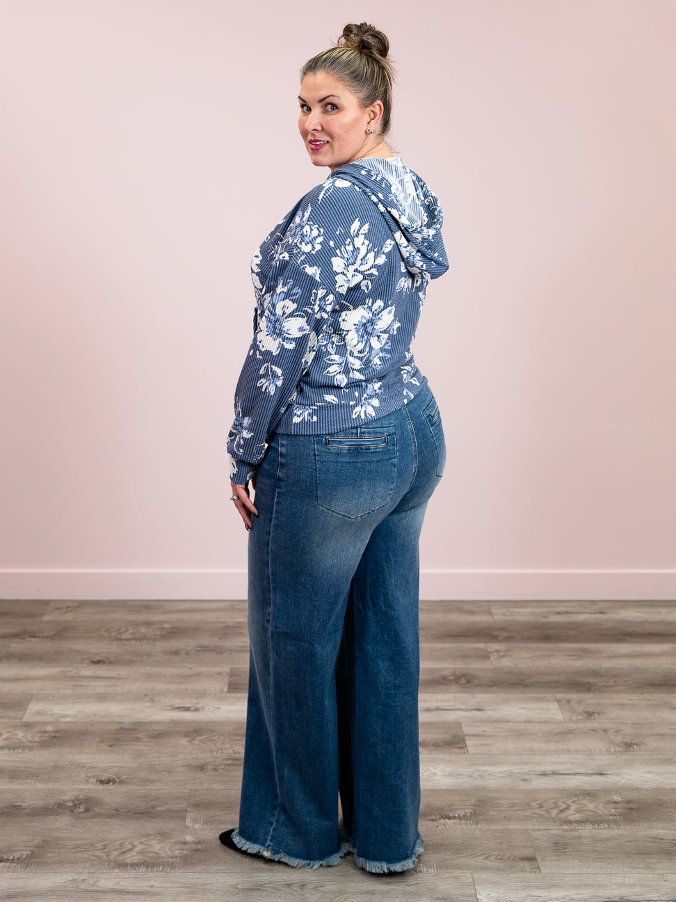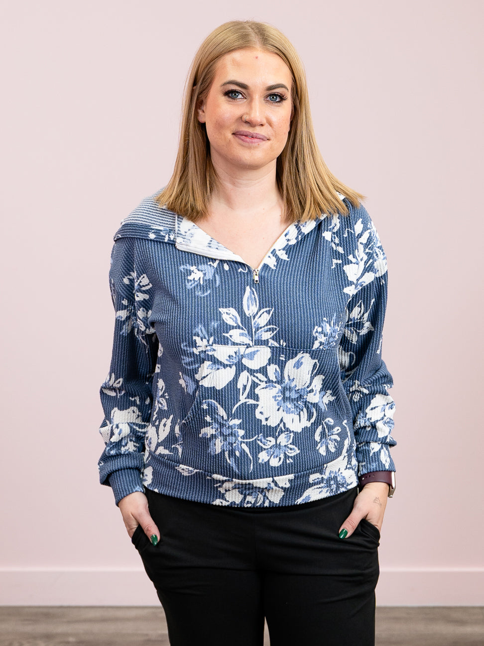 Slip into effortless comfort with this charming ribbed hoodie, featuring a cozy kangaroo pocket perfect for keeping your hands warm or stashing your essentials. The lightweight quarter-zip design makes layering a breeze, while the playful faded garden floral pattern in navy adds a touch of whimsy to your everyday wardrobe. Ribbed throughout for a flattering fit that moves with you, this hooded essential is your new go-to for casual days and relaxed vibes.