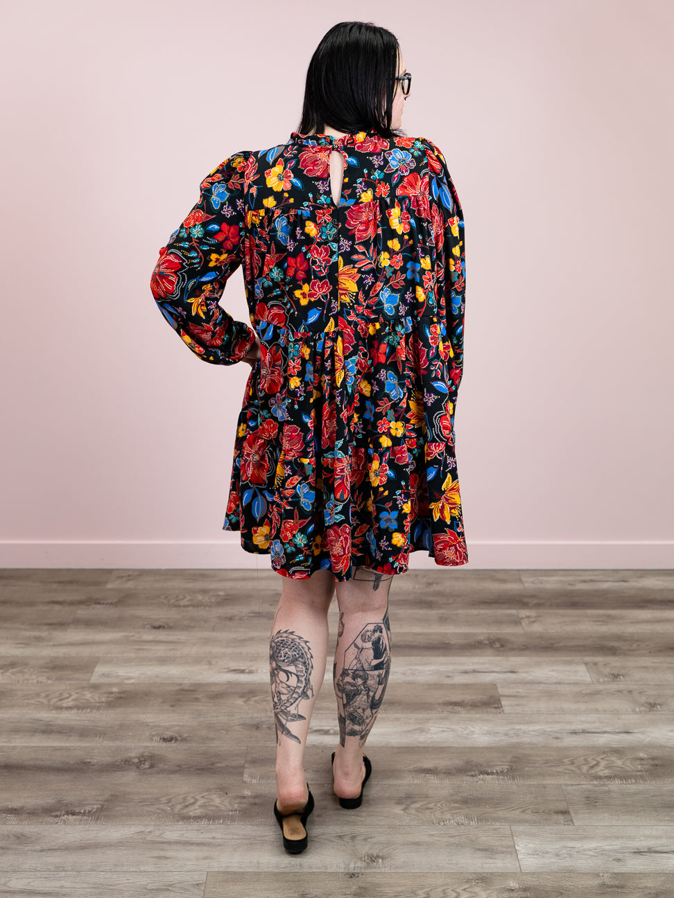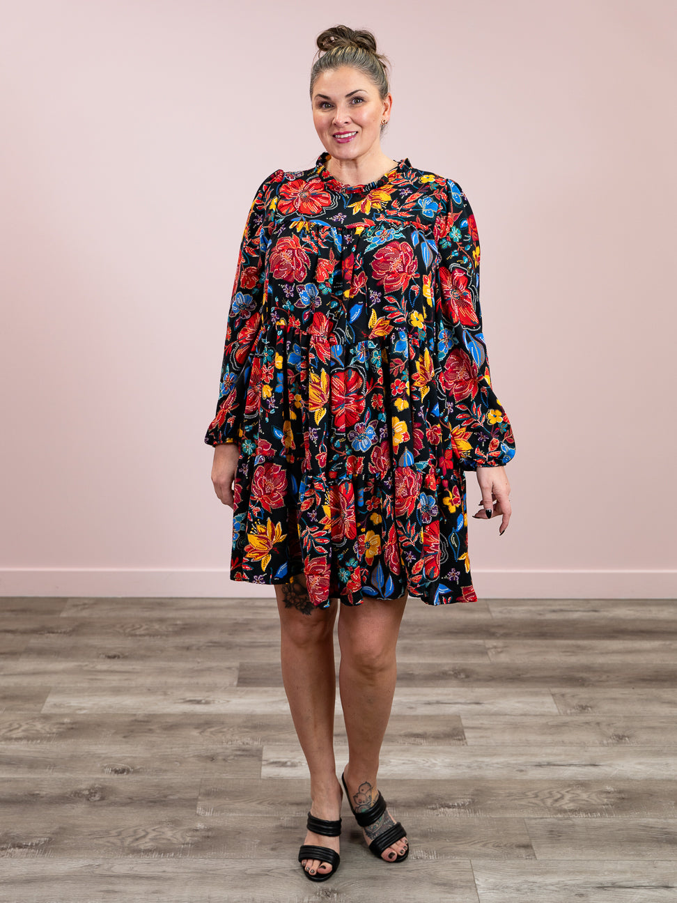 The Makayla Floral Tiered Dress features a romantic ruffle neckline, back keyhole with button closure, and long sleeves with elastic cuffs. Its tiered silhouette, lightweight feel, and floral design make it perfect for any occasion.