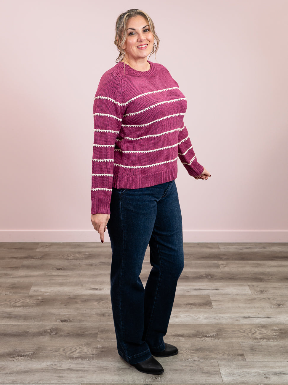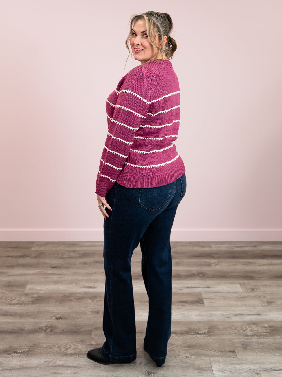 Slip into cozy comfort with the Marsha Striped Pullover Sweater! This snug-fitting knit features charming white stripes that add a playful pop of contrast against the rich dark magenta base. The classic round neckline keeps things effortlessly chic, while the super soft fabric feels like a warm hug all day long. Perfect for layering or wearing solo, this sweater is your new go-to for casual elegance with a touch of whimsy.