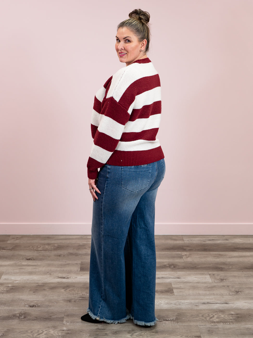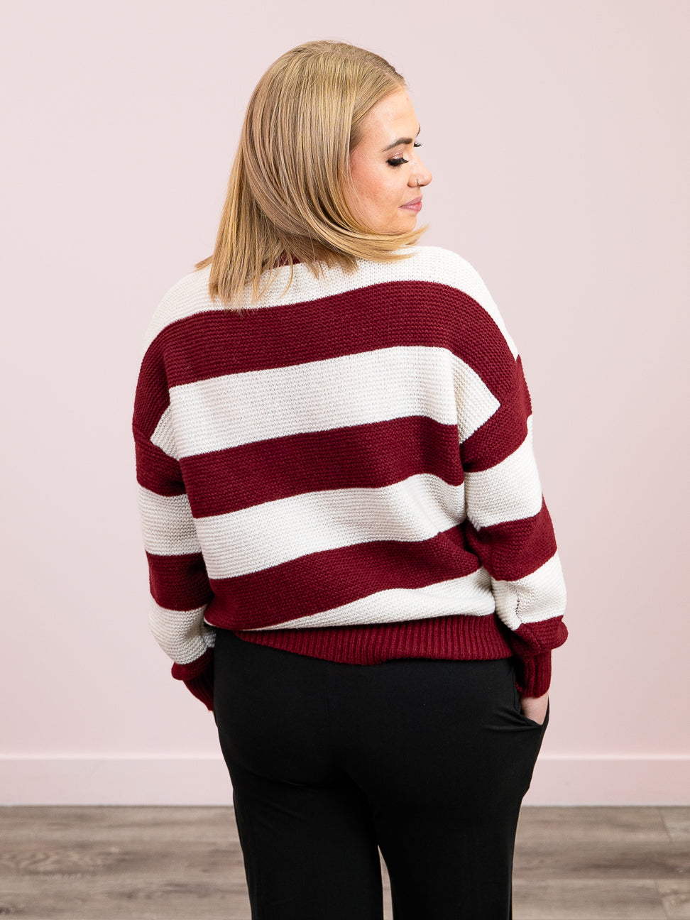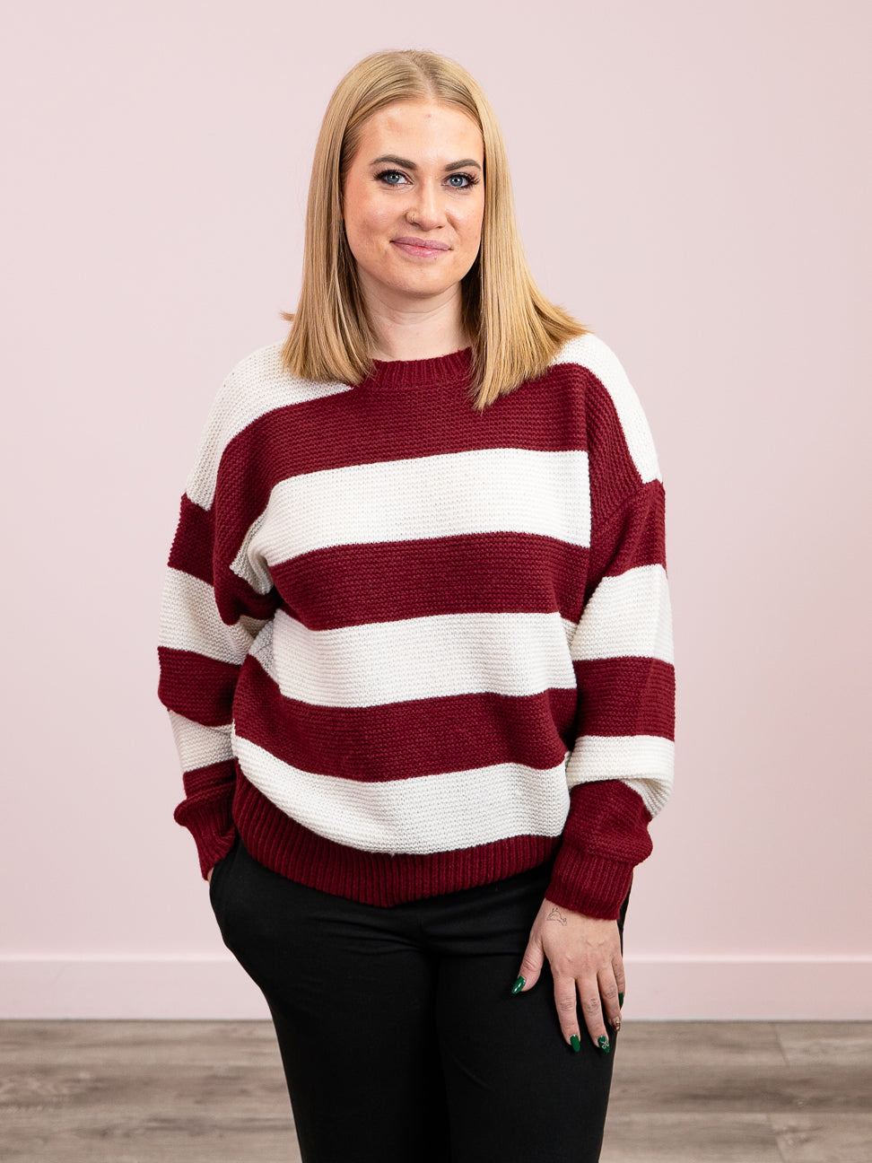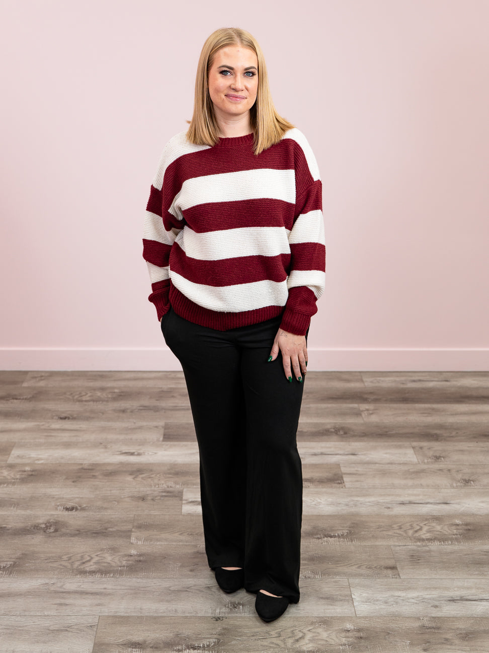 Meet your new favorite sweater! The Elena features a plush, stretchy knit that hugs you just right, paired with a bold thick stripe pattern for instant visual interest. The round neckline and ribbed cuffs, hemline, and neckline keep everything neat and secure, so you can focus on looking fabulous. Soft enough to live in, stylish enough to wear everywhere—this is the sweater that does it all.