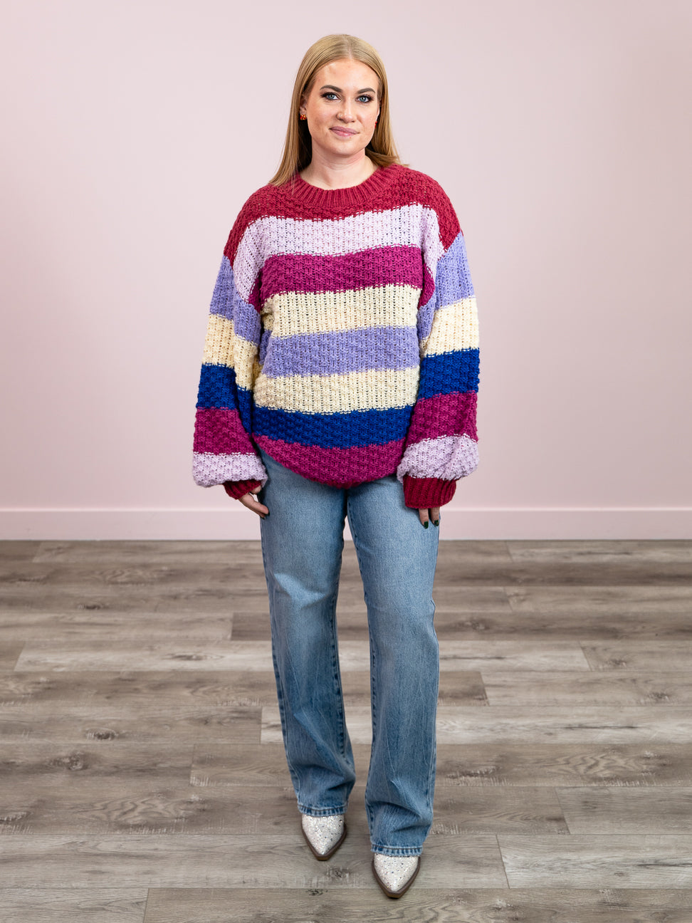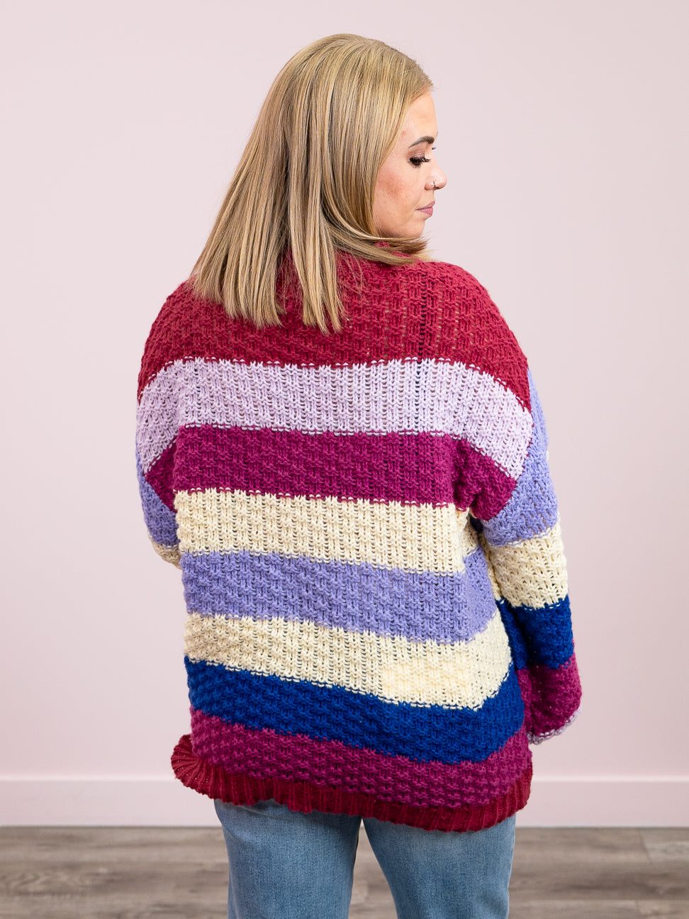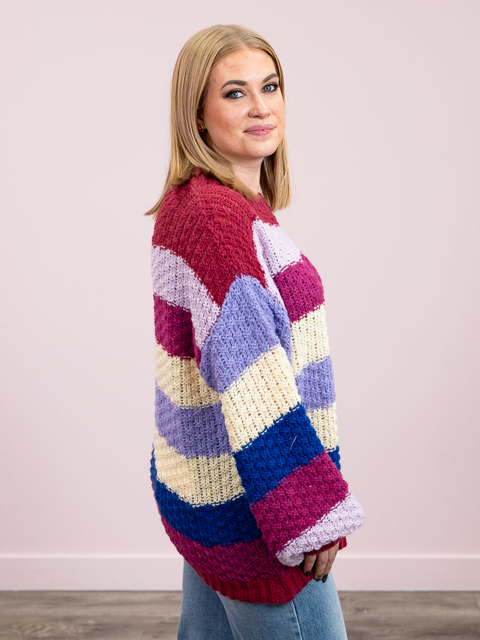 Wrap yourself in cozy comfort with the Tehya Chunky Knit Pullover, featuring a delightfully chunky knit that's perfect for layering through the seasons. The relaxed drop shoulder silhouette offers an effortlessly cool vibe, while the vibrant multi-coloured stripe pattern adds a pop of personality to any outfit. Ribbed detailing at the neckline, hemline, and cuffs keeps everything snug and polished. Whether you're curling up with a book or heading out for casual adventures, this playful pullover is your new go-to piece.