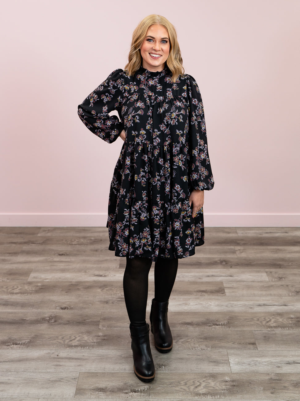 The Makayla Floral Tiered Dress features a romantic ruffle neckline, back keyhole with button closure, and long sleeves with elastic cuffs. Its tiered silhouette, lightweight feel, and floral design make it perfect for any occasion.
