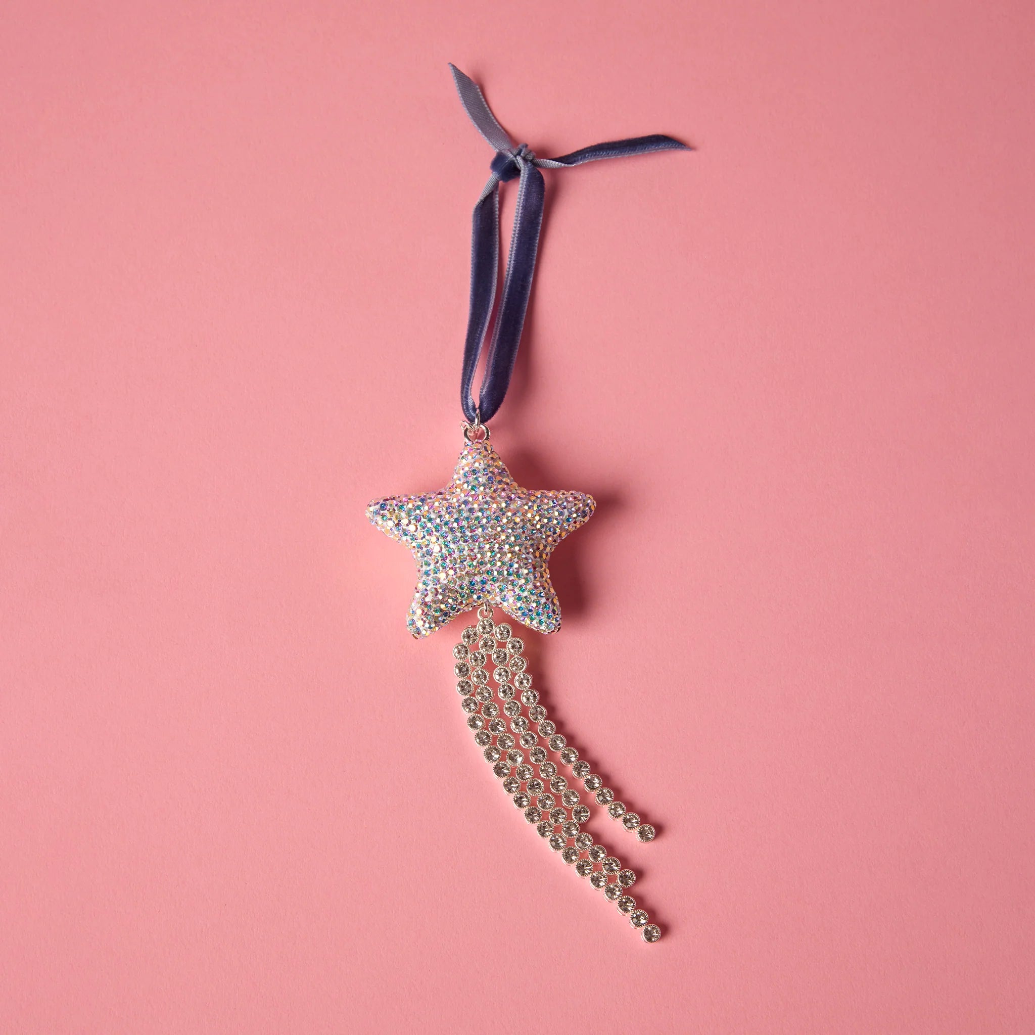 - Hand-set crystals and silver tassels mimic the movement of a shooting star.
