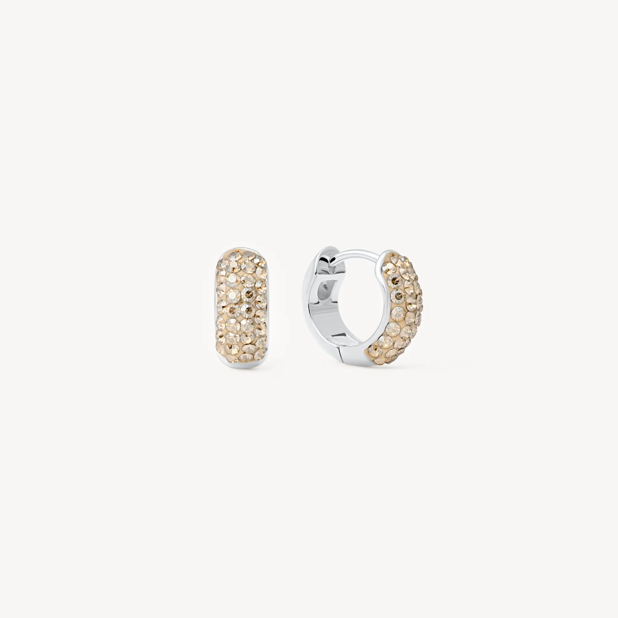 Small but full of presence, the Mini Sparkle Hoops return in Soft Gold—a tone that glows with quiet luxury. Hand-set crystals in a warm, golden hue create a refined shimmer that pairs effortlessly with both 14k gold vermeil and sterling silver finishes. Lightweight, versatile, and designed for daily wear, these 12mm hoops bring understated radiance to any look. A limited-edition release, made to shine in every moment worth celebrating.