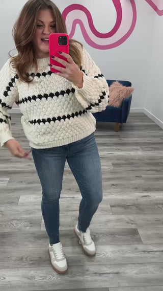 Meet the Edna Striped Sweater — your new everyday favorite. Designed with a classic round neck, dropped shoulders, and long sleeves, it’s all about effortless comfort. The chunky, stretchy knit adds cozy texture, while rib knit trim and bold stripes give it a timeless, laid-back feel.