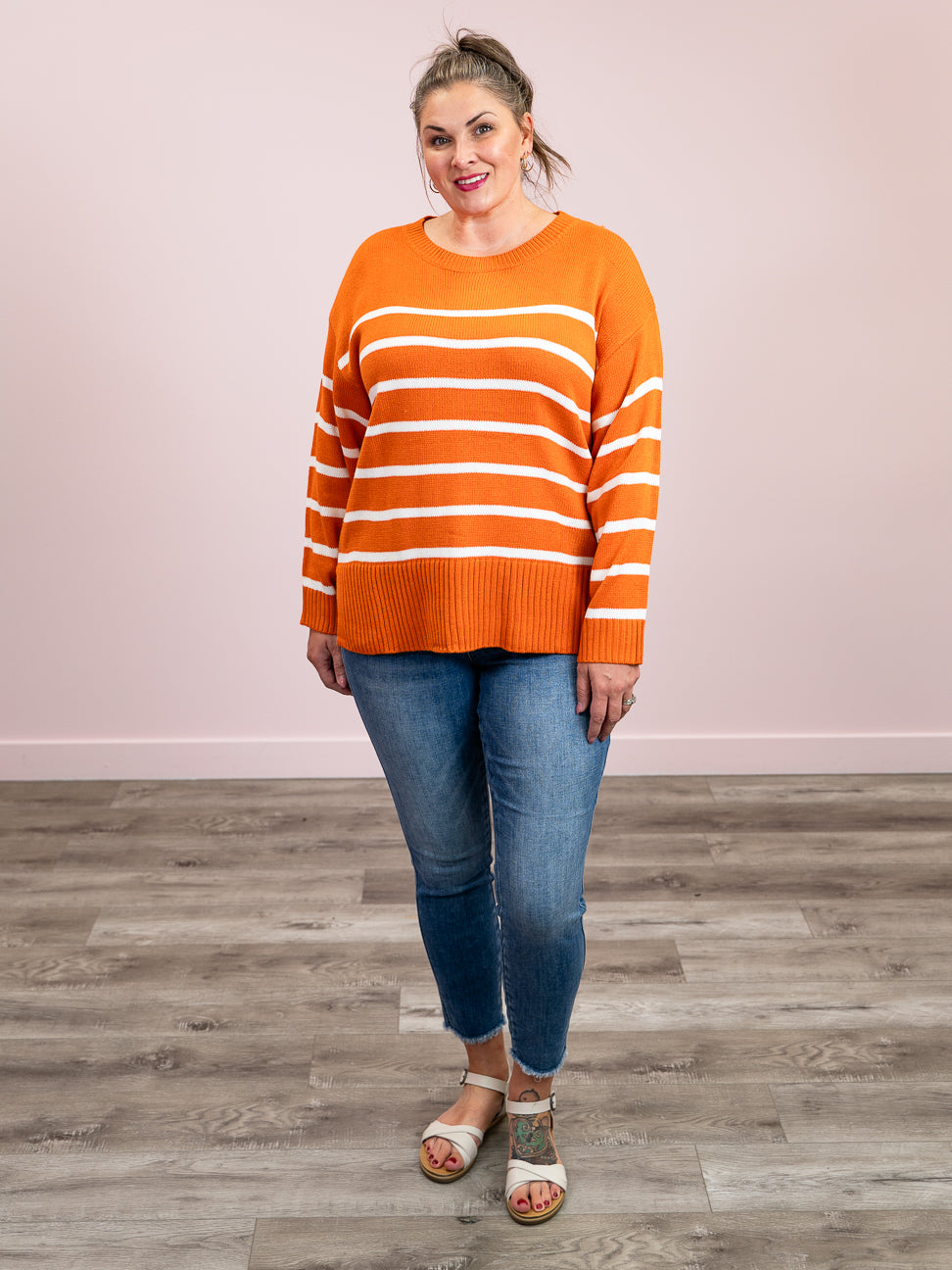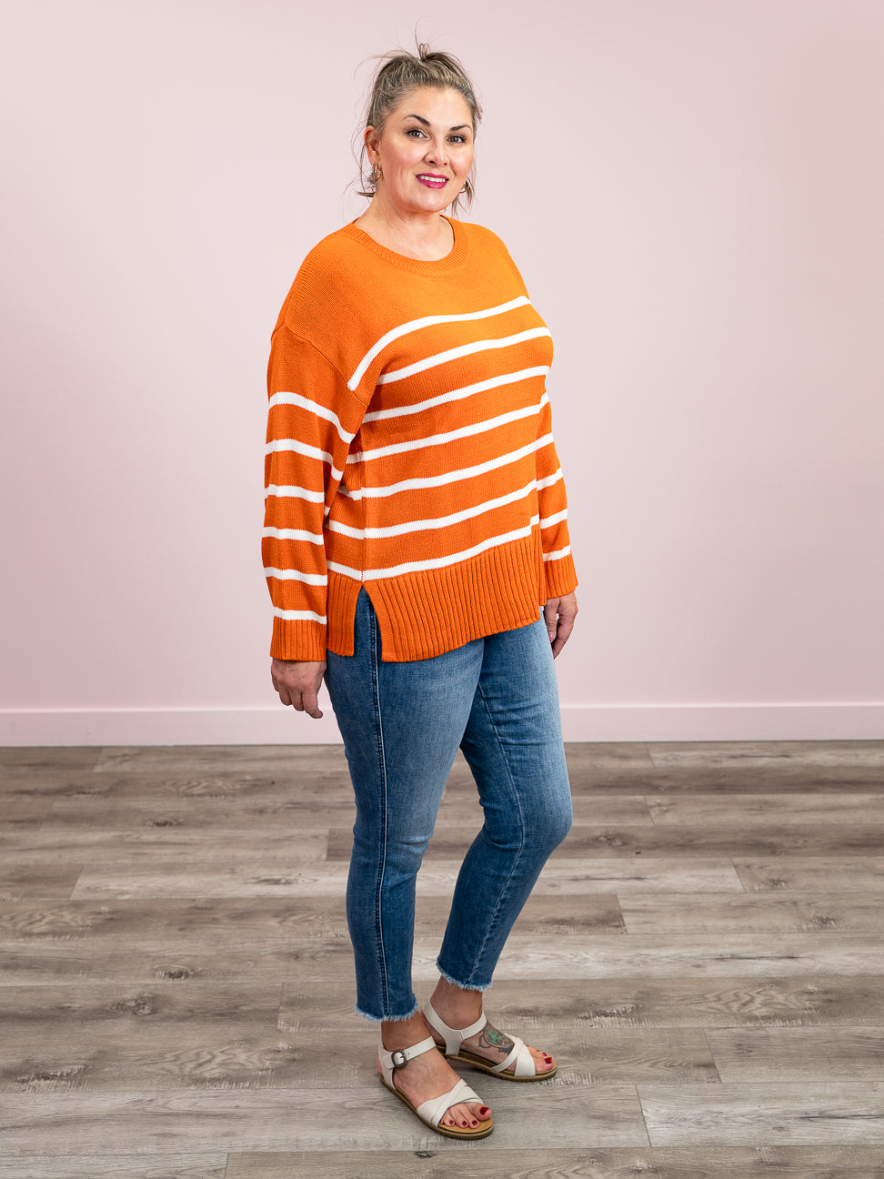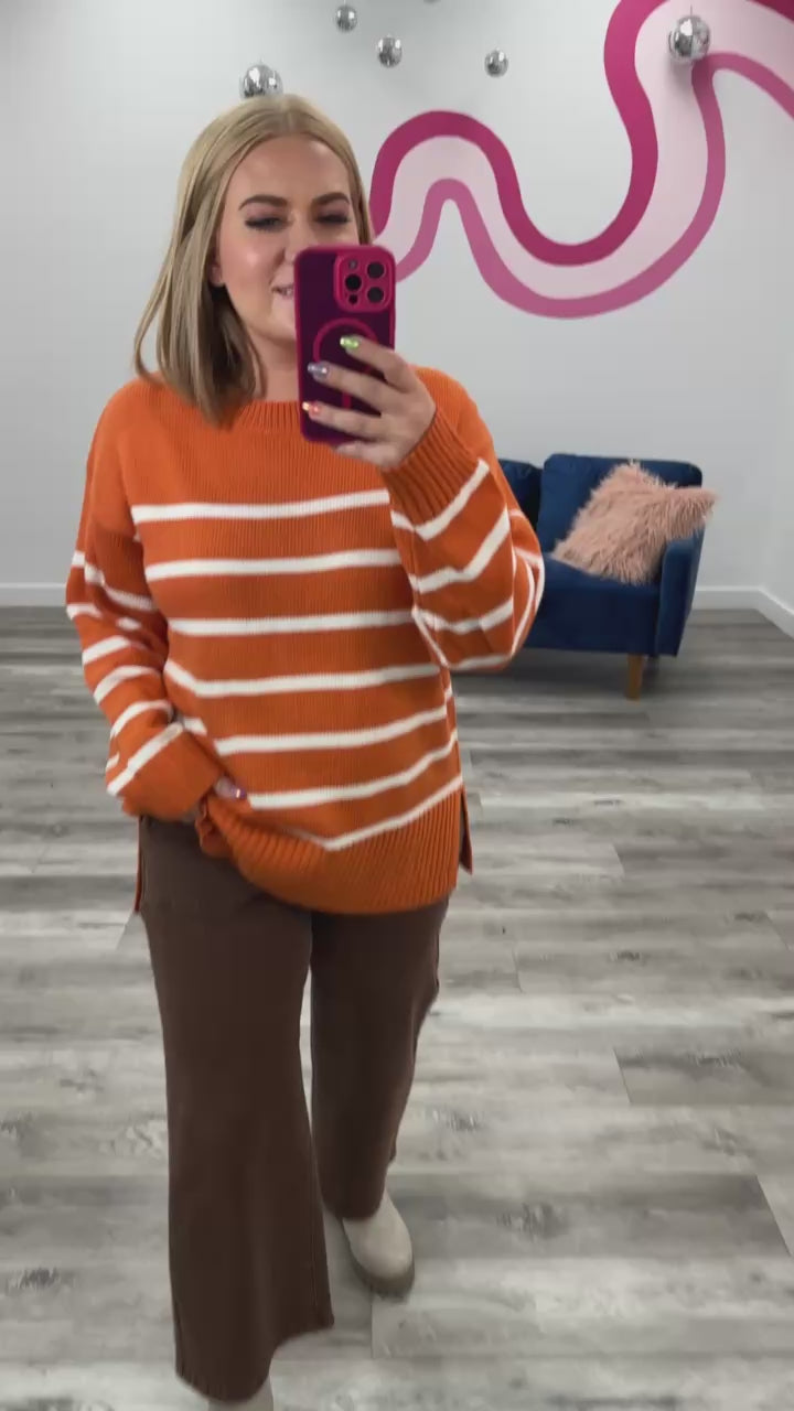 Get ready to fall in love with the Elaine Striped Sweater! With its relaxed fit, dropped shoulders, and stripe design, this sweater is both comfy and cute. The round neck and rib knit trim add just the right touch of detail, while long sleeves and side slits keep things cozy and breezy. Perfect for any laid-back day where style meets ease!