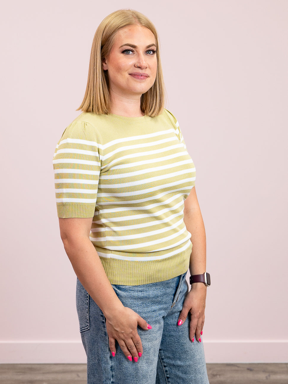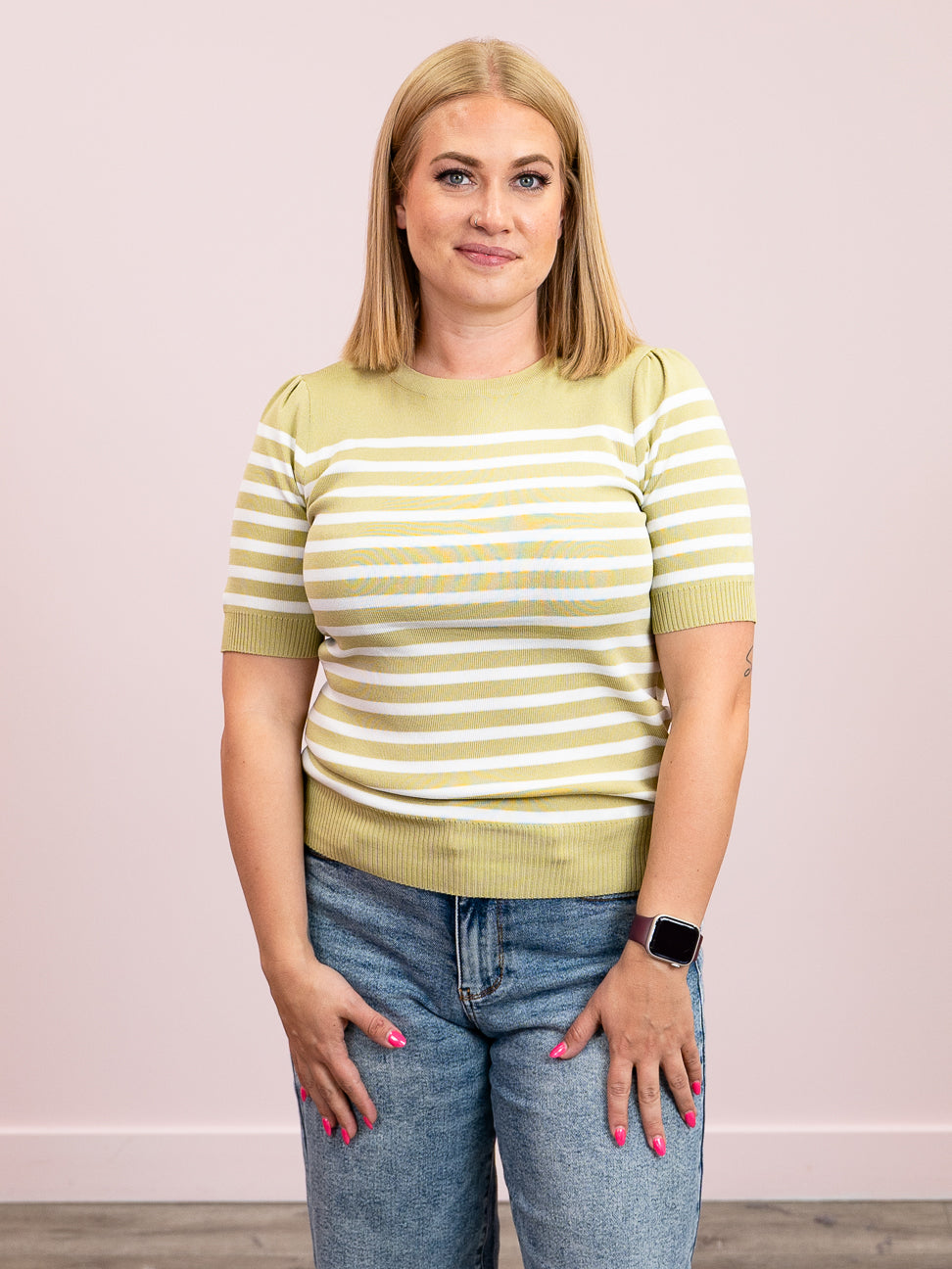 Effortlessly chic, the Monroe Top features a classic round neckline, short puff sleeves, and a playful striped design. The keyhole back with button adds a subtle touch of charm, while rib knit trim and stretchy fabric ensure a comfortable, flattering fit.