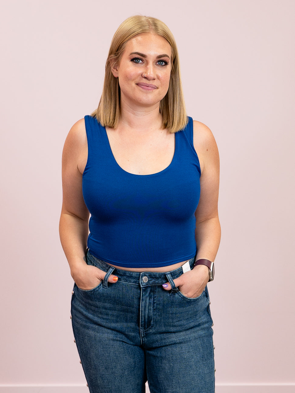 Meet your new favorite tank: the Shelly Cropped Tank! With a scoop neck and wide, bra-friendly straps, it’s designed for comfort and style. The buttery soft fabric feels amazing against your skin, while the double lining adds extra support. Its fitted, cropped length makes it perfect for pairing with high-waisted favourites.