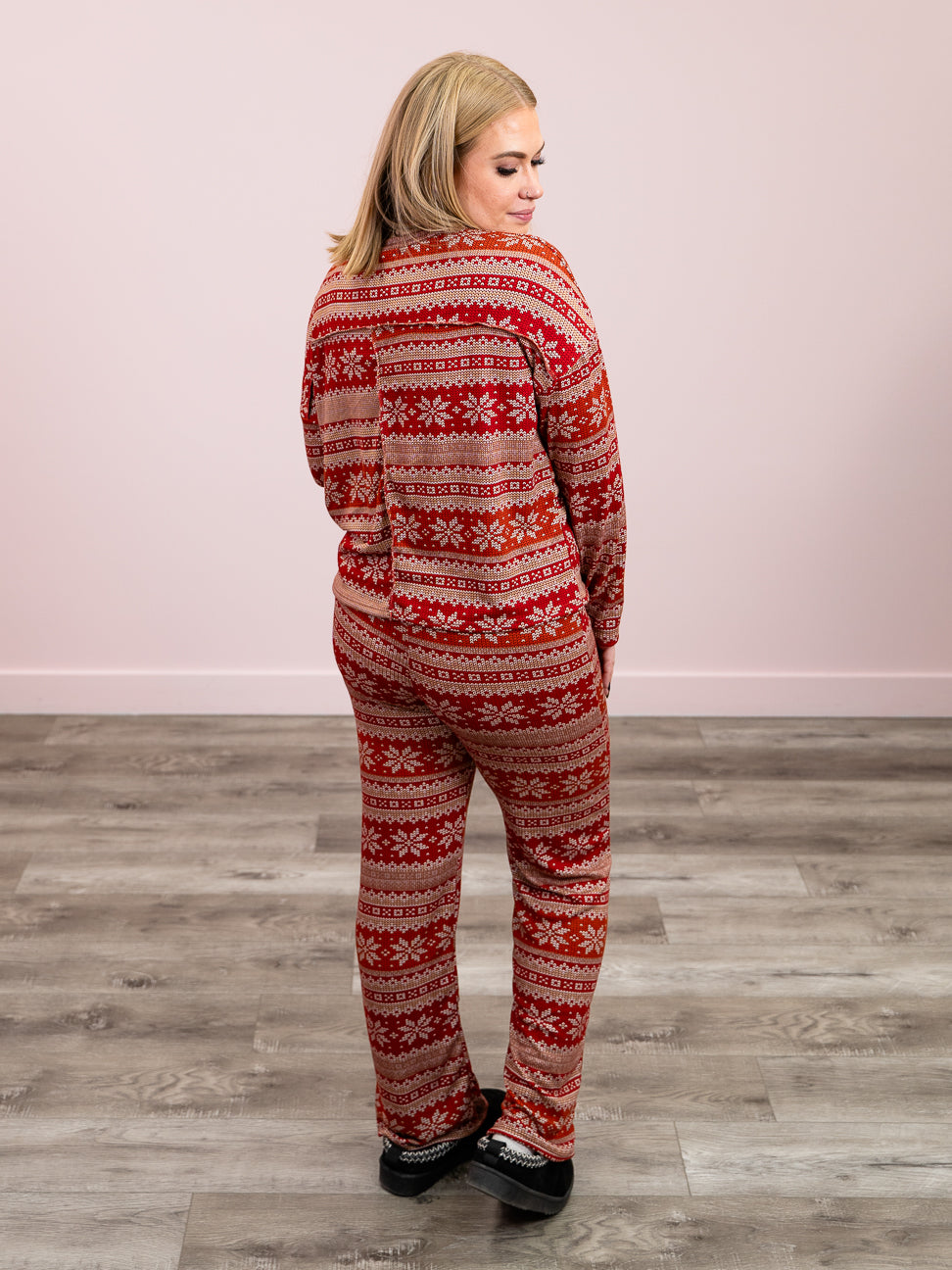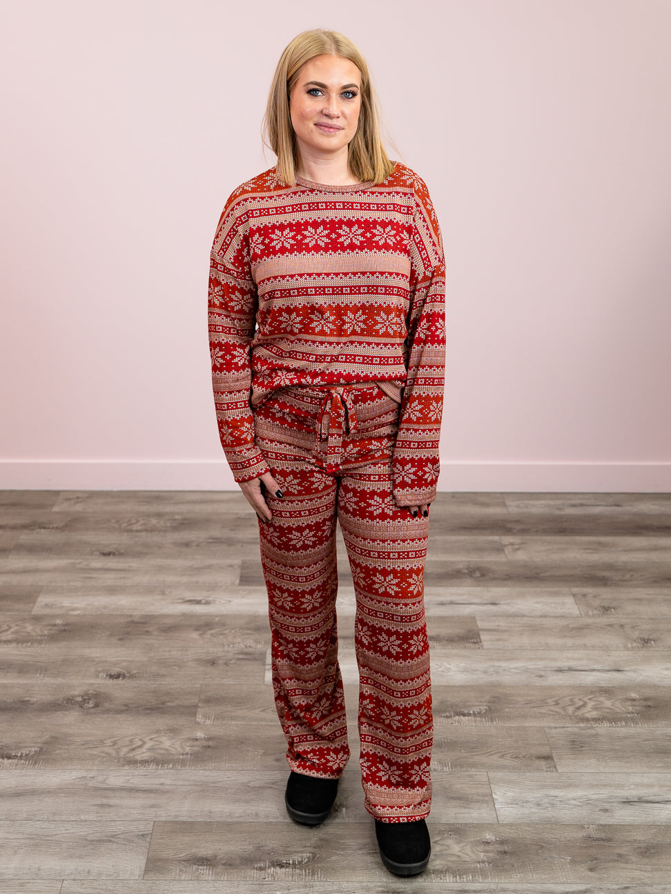 Cozy up in the Snowflake Kiss Lounge Set! The top features a relaxed fit with a round neck, dropped shoulders, and long sleeves, all crafted from buttery soft fabric for ultimate comfort. The high-rise bottoms offer an elastic waist with a drawstring and a straight leg fit. Adorned with a charming snowflake design, this set wraps you in warmth and style with a delightful touch of winter magic.