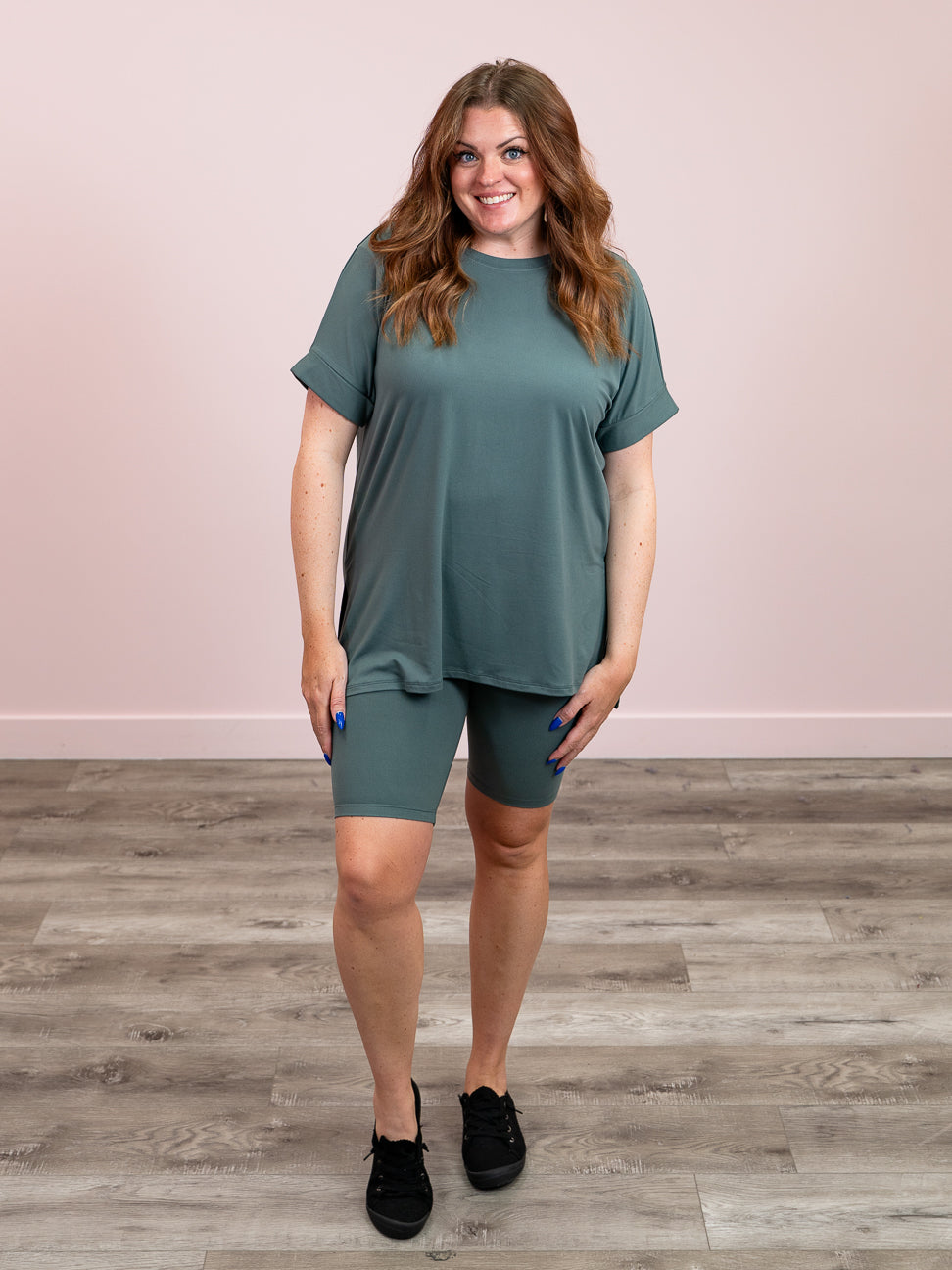 The Hollie Set is the perfect wardrobe essential! Constructed from a lightweight fabric, the set includes a tee with a round neck, cuffed short sleeves and a hi-low hem with side slits. The shorts are high rise with an elastic waist and biker short design. These sets are so buttery soft, you'll want to live in them!