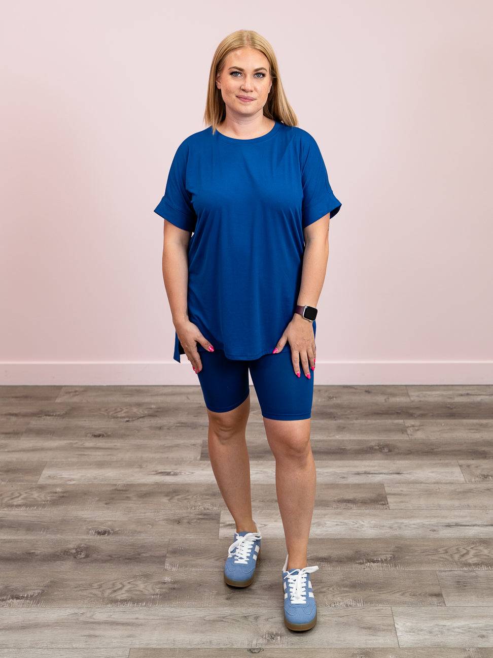 The Hollie Set is the perfect wardrobe essential! Constructed from a lightweight fabric, the set includes a tee with a round neck, cuffed short sleeves and a hi-low hem with side slits. The shorts are high rise with an elastic waist and biker short design. These sets are so buttery soft, you'll want to live in them!