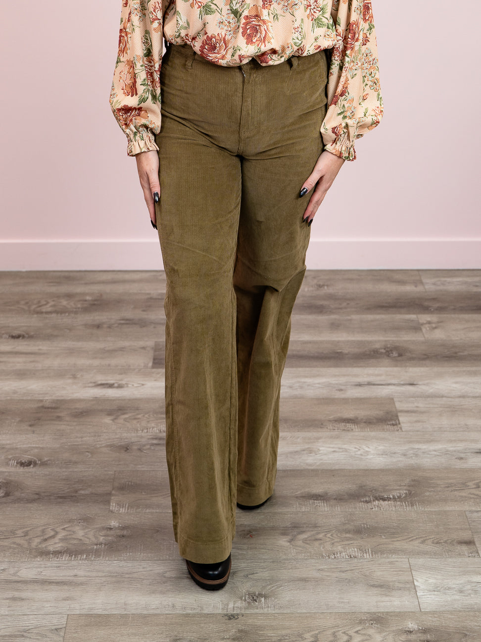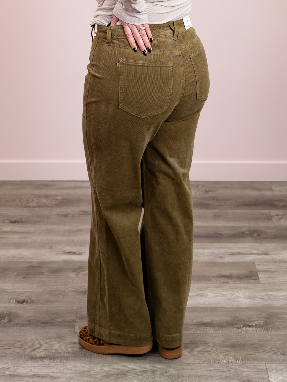 Step into the '70s with these Judy Blue high-rise wide-leg corduroy pants in a gorgeous olive tone. The retro silhouette features a flattering high waist, relaxed wide legs, and a charming crossed belt loop detail at the back for that authentic vintage vibe. Crafted in soft corduroy, they're perfect for channeling effortless retro style with modern comfort. A wardrobe essential that brings groovy nostalgia to any outfit.