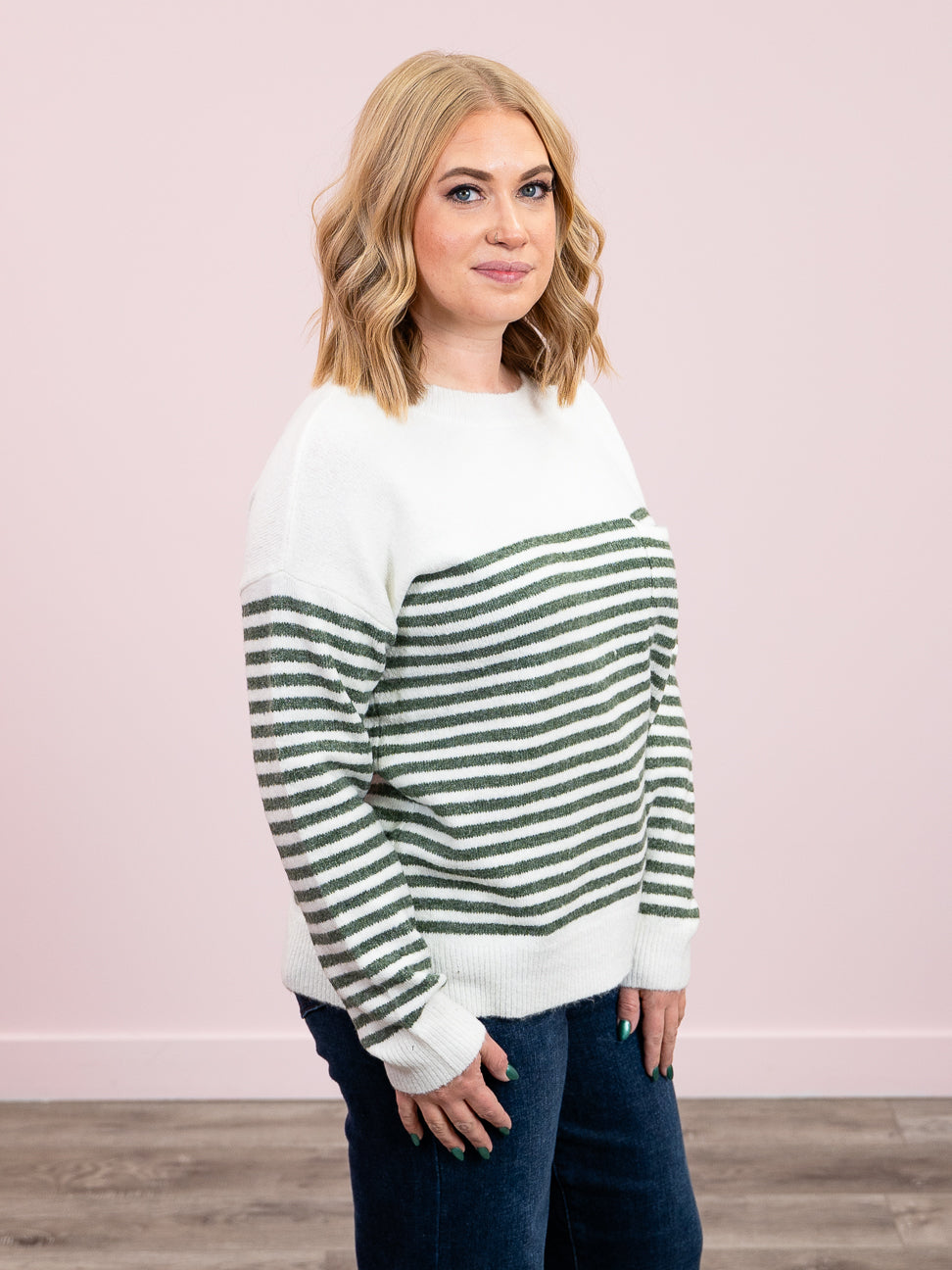 Cozy up in this charming striped sweater that's as soft as a cloud! Crafted from fine knit fabric, it features a classic round neckline with ribbed trim for a polished finish. The playful striped detailing adds visual interest, while the practical chest pocket keeps your essentials within reach. Ribbed cuffs complete the look with a refined touch. Perfect for layering or wearing solo, this dark sage beauty is your new go-to for effortless style and comfort.