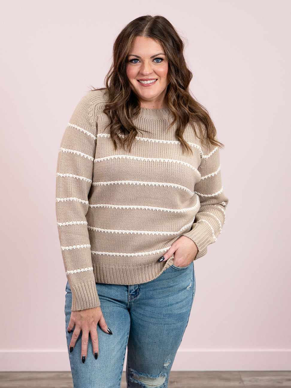 Cozy up in this charming Marsha striped pullover, where comfort meets style! Crafted from soft knit material, this sweater features delicate thin stripes that add visual interest without overwhelming your look. The ribbed trim at the cuff, neckline, and hem keeps everything in place while adding a polished finish. With its relaxed round neckline and straight hemline, it's the perfect piece for effortless layering or standalone wear. Whether you're sipping coffee or catching up with friends, this taupe beauty is your new go-to for casual elegance.