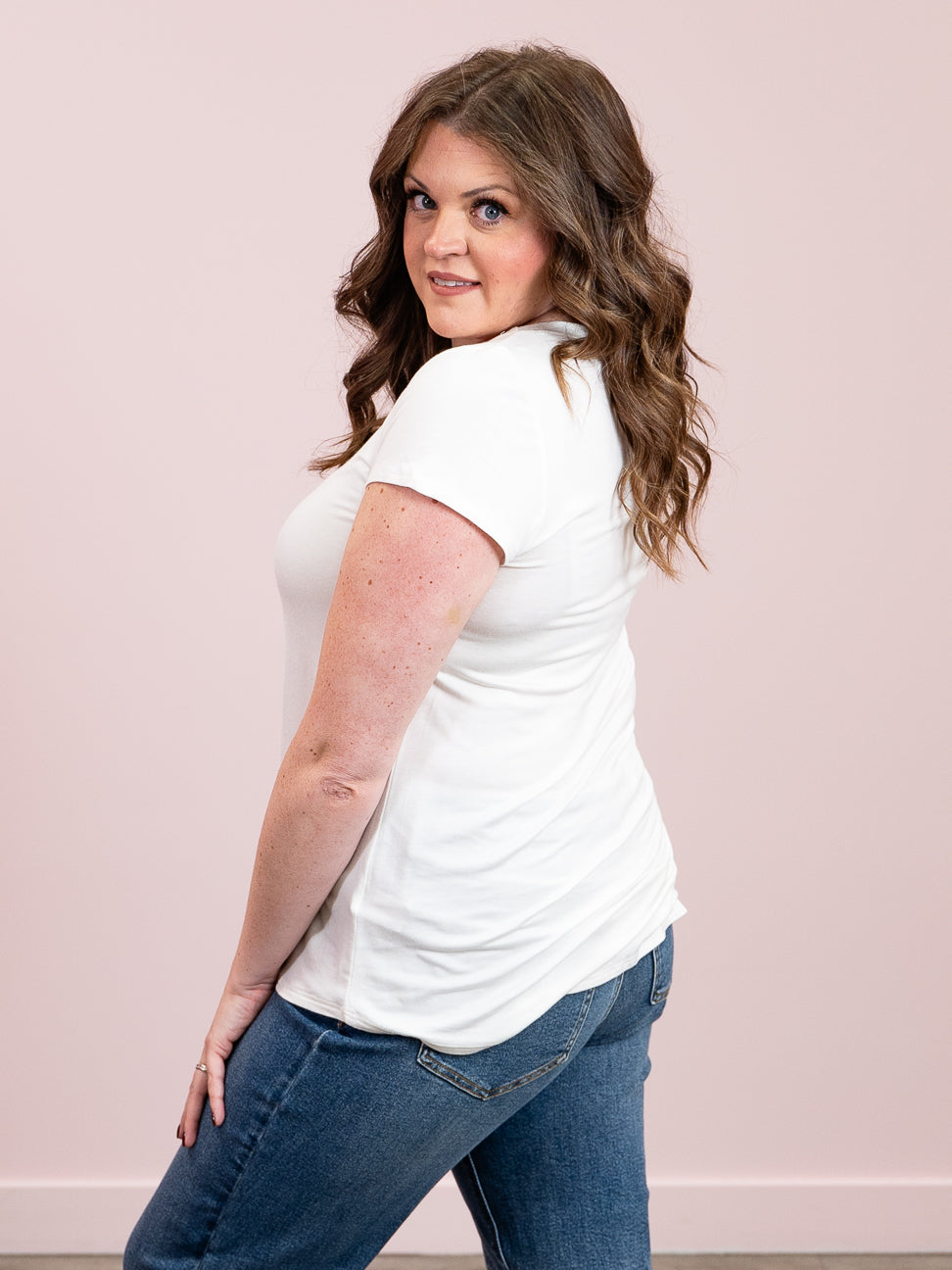 We Love It & You Will Too!! This will be your new favourite basic tee featuring soft, solid fabric, a comfortable loose yet flattering fit, short sleeves, and a slight hi-lo hem. This piece is perfect to pair with jeans or leggings, or to layer under cardi's and jackets! Versatile and basic with the perfect fit, this top is an absolute staple in your collection. Pick your favourite colours and you're ready to take on your day!