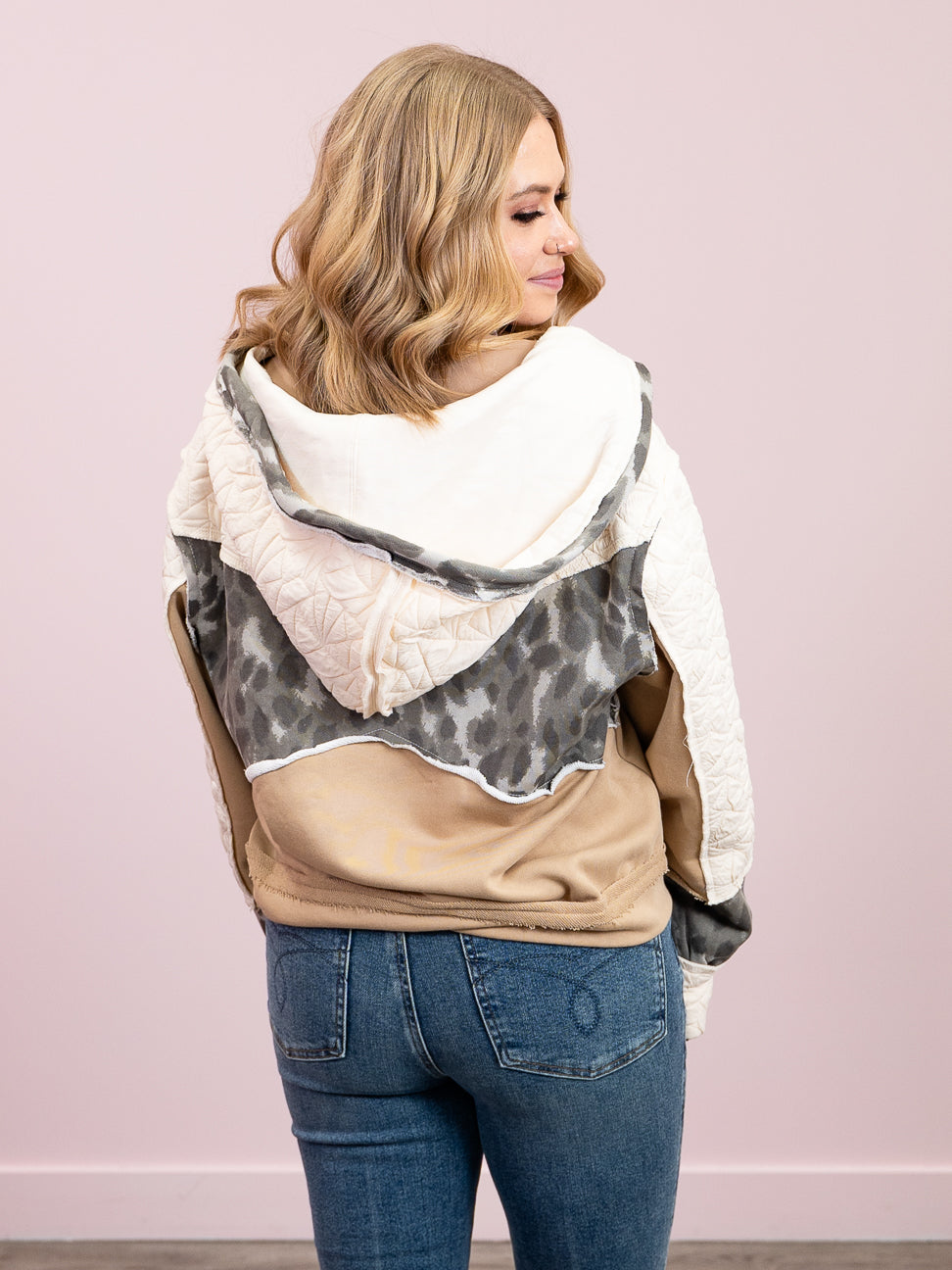 Rock a bold look with this hooded jacket that blends leopard, cream, and beige in eye-catching colour-blocks. The full zip makes layering effortless, while decorative stitching details on the arms, cuffs, and hood add personality and dimension. Perfect for casual days when you want to stand out with style and attitude.