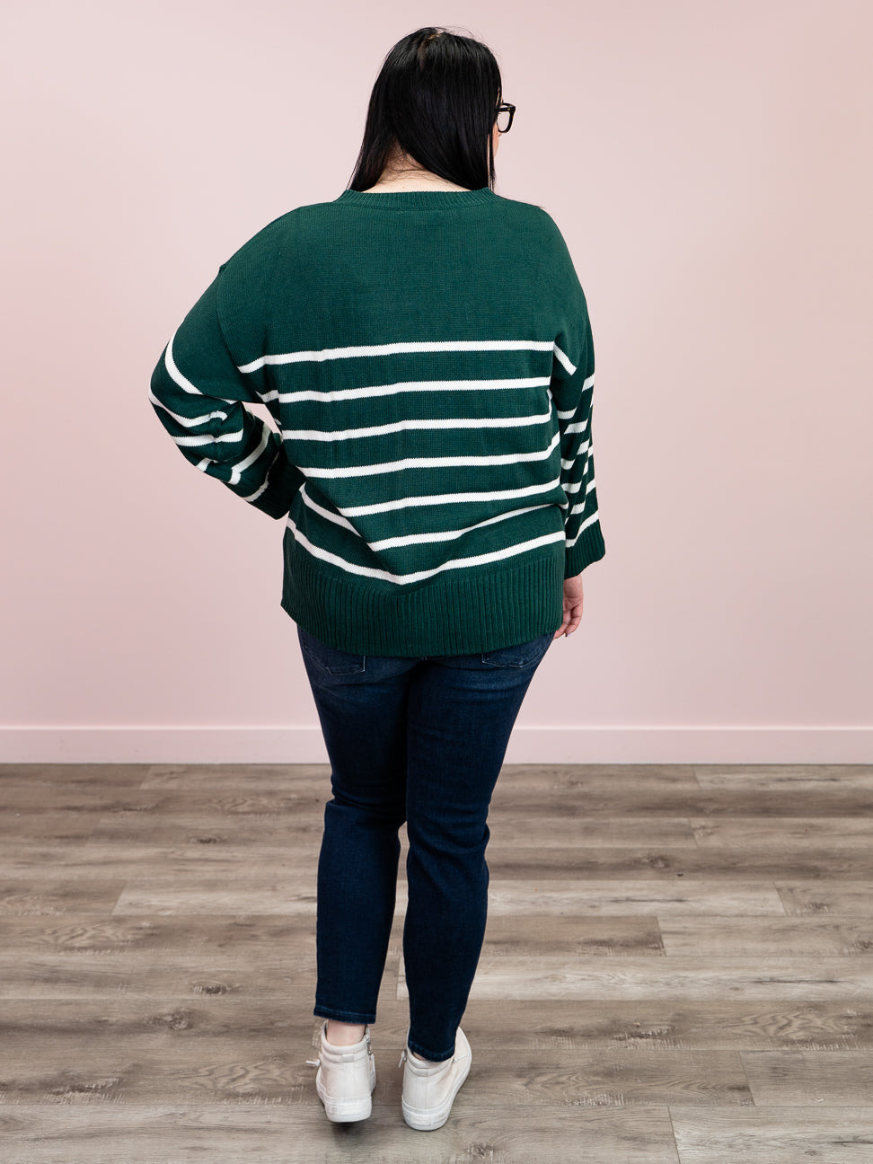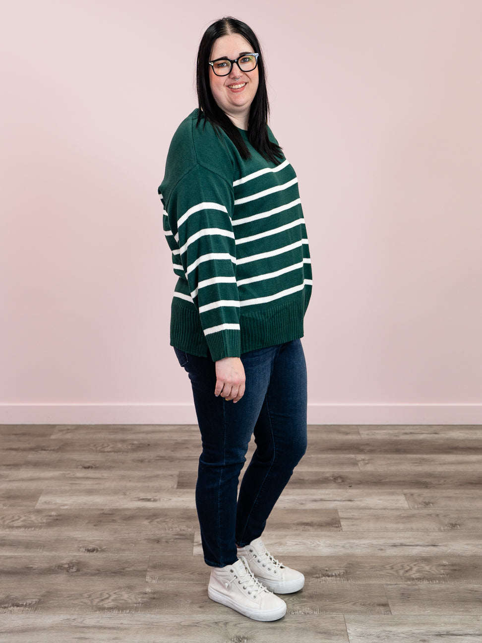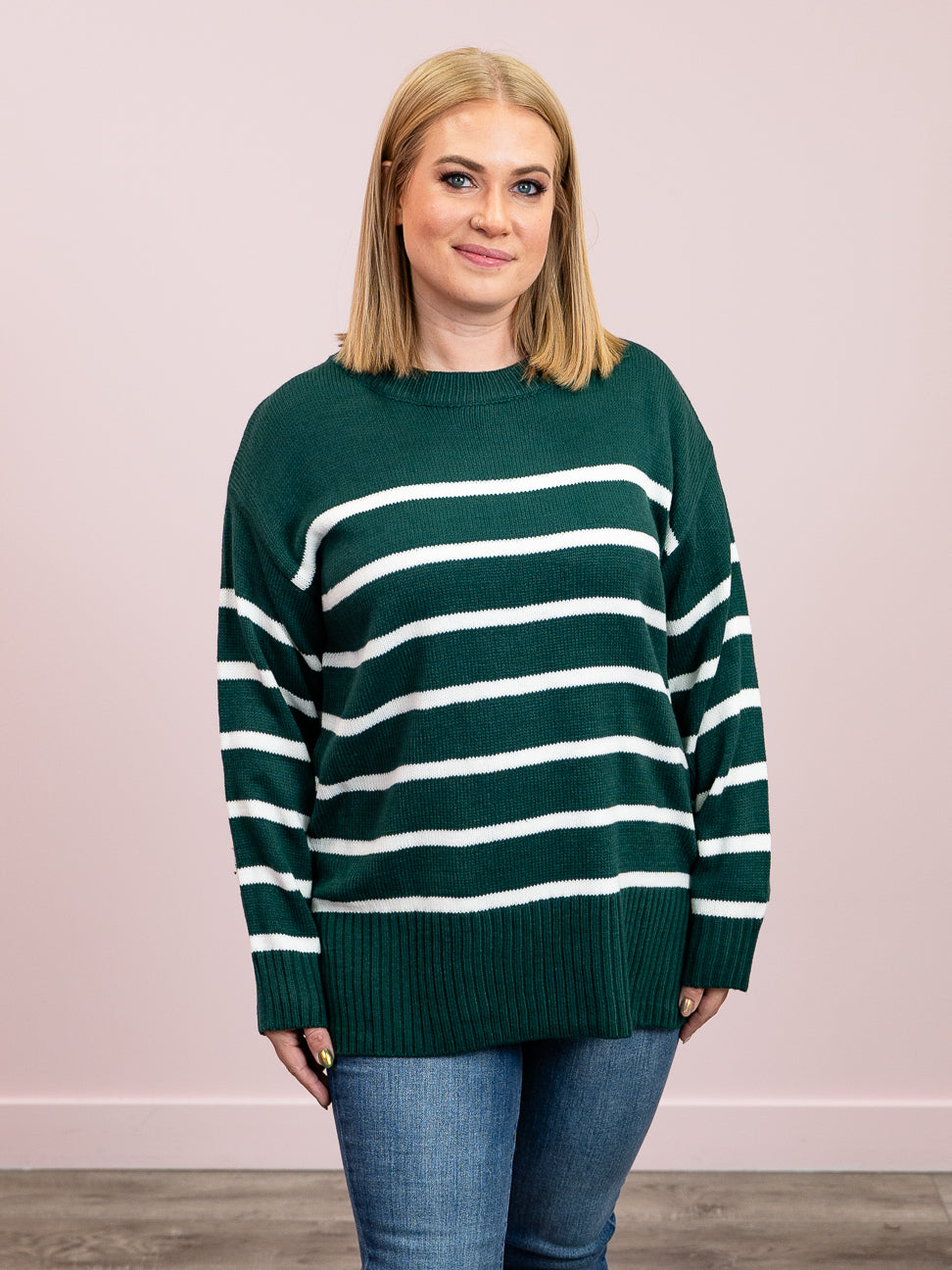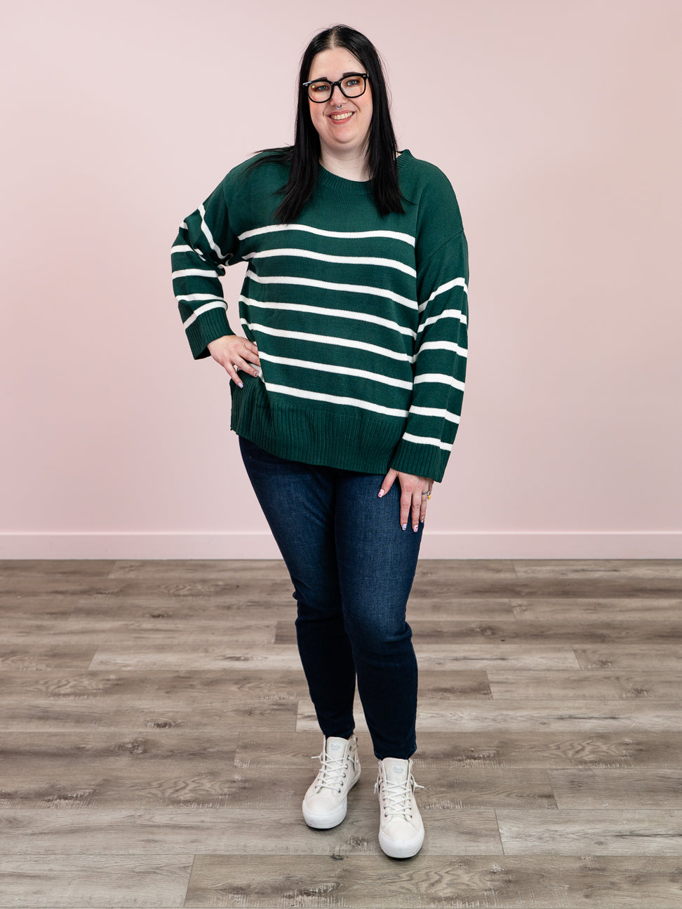 Cozy up in the Elaine Striped Sweater, where classic stripes meet comfort. Featuring a relaxed fit, dropped shoulders, and long sleeves with ribbed trim, this pullover is perfect for easy days. Side slits add a fun twist, making it your go-to for layering or lounging in style.