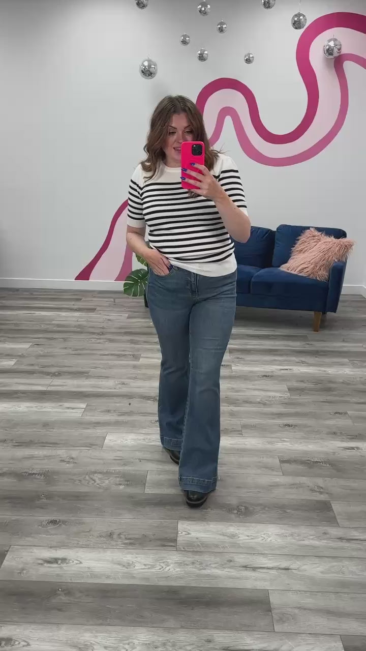 The Judy Blue Braden Jeans offer a high-rise fit with tummy control and a double button closure for extra support. Featuring whiskering on the hips and a flattering flare in a versatile mid wash, these jeans combine comfort and style effortlessly.