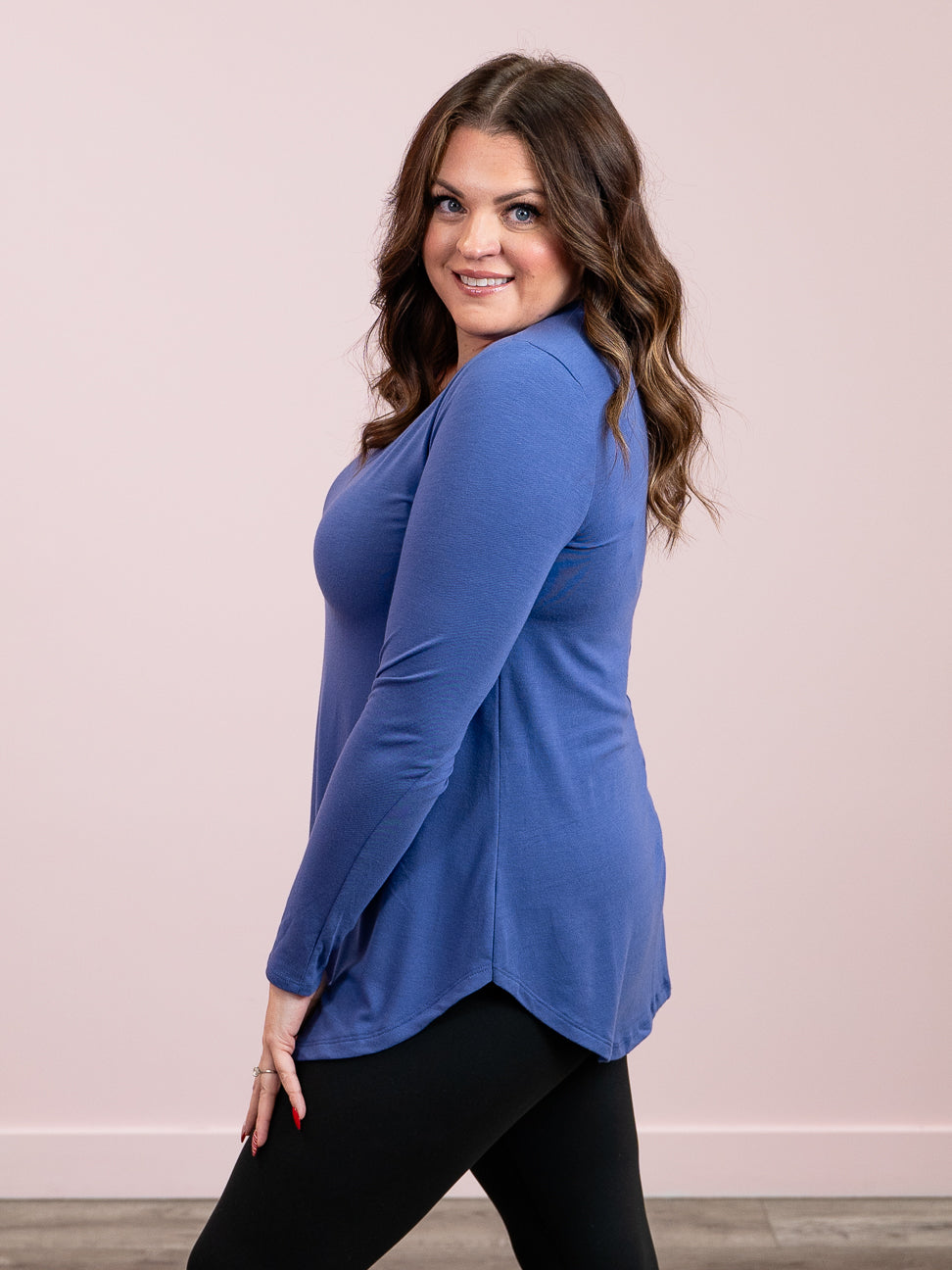 The Jenny Long Sleeve Top is the perfect mild weather piece. Soft and stretchy, for maximum comfort. Featuring a V-neck, long sleeves, curved hem and center seam running vertical down back. Looks awesome paired with leggings and sneakers for casual day vibes.