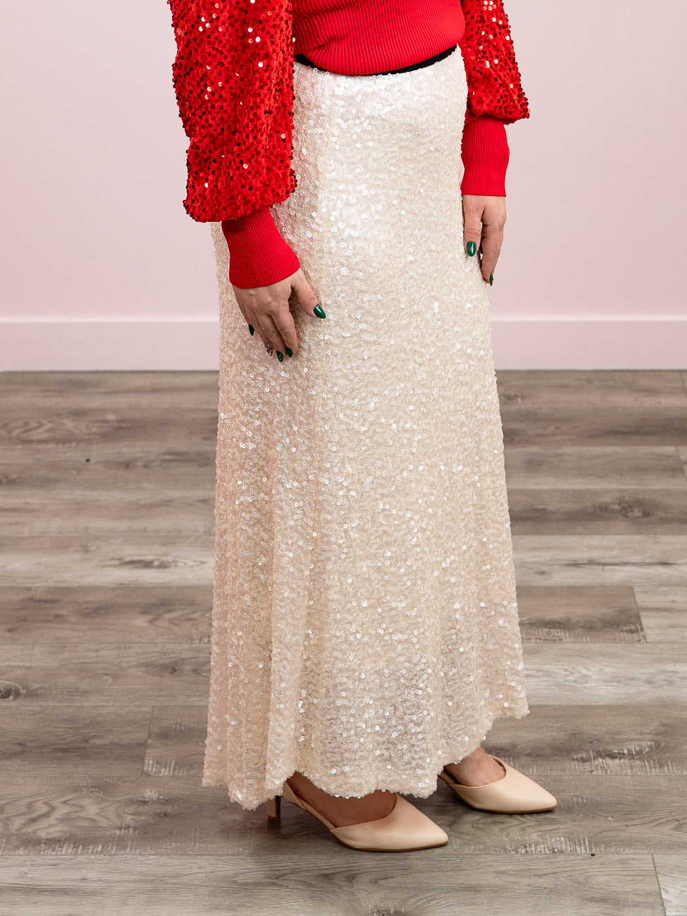 She catches the light with every step thanks to her all over shimmering sequins and sweeping maxi silhouette. Designed with a high rise and bold contrast waistband, she's equal parts glam and cool. Pair her with an oversized knit or silky cami for a night that sparkles.