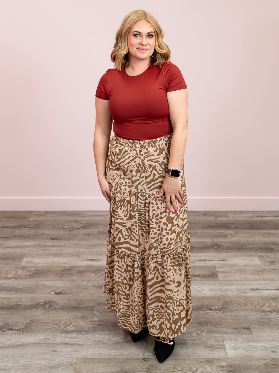 Unleash your style with the Wild Instincts Tiered Midi Skirt. Designed with a high-rise fit, comfy elastic waist, and a flattering tiered silhouette, this midi-length skirt features a fierce leopard print that brings a wild touch to any look.