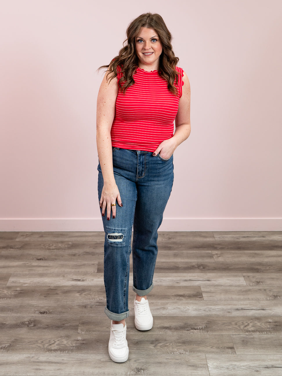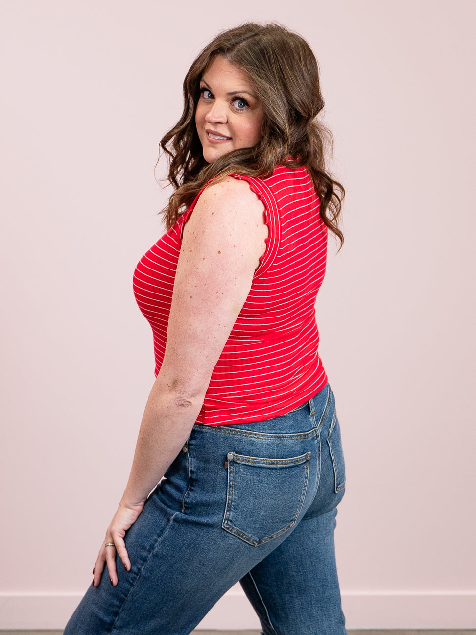 *SUNDAY STEAL* Camie Ribbed Ruffle Stripe Tank Top | Ruby & White