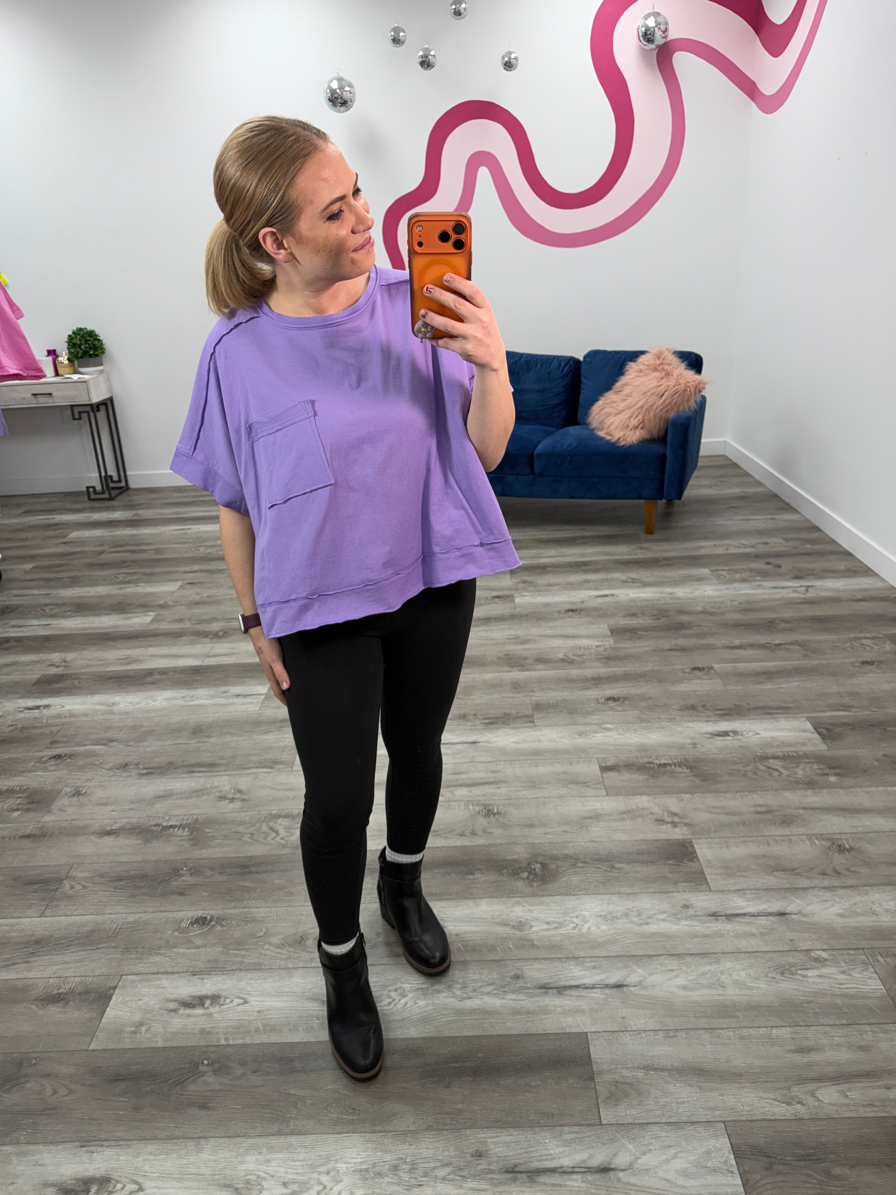The Sammie Crop Boxy Tee is your new go-to for that perfectly slouchy vibe. With a relaxed, boxy fit and cropped length, it hits just right—pair it with your favorite high-waisted bottoms or layer it over a slip dress. A handy chest pocket adds function to the fun, while the exposed hem gives it that intentional, undone edge. Casual never looked so good.