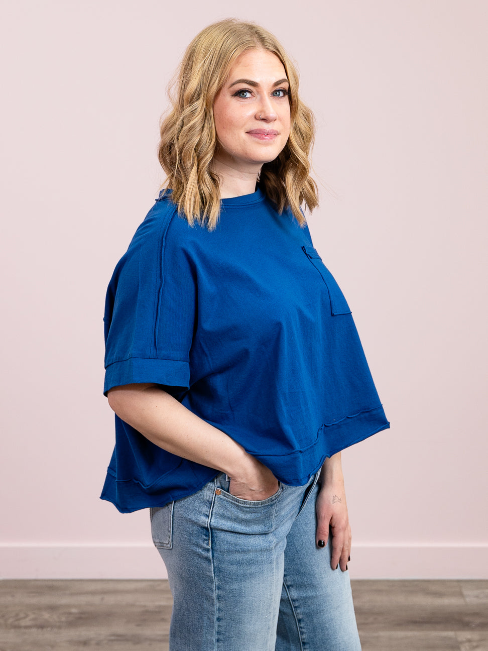 The Sammie Crop Boxy Tee is your new go-to for that perfectly slouchy vibe. With a relaxed, boxy fit and cropped length, it hits just right—pair it with your favorite high-waisted bottoms or layer it over a slip dress. A handy chest pocket adds function to the fun, while the exposed hem gives it that intentional, undone edge. Casual never looked so good.
