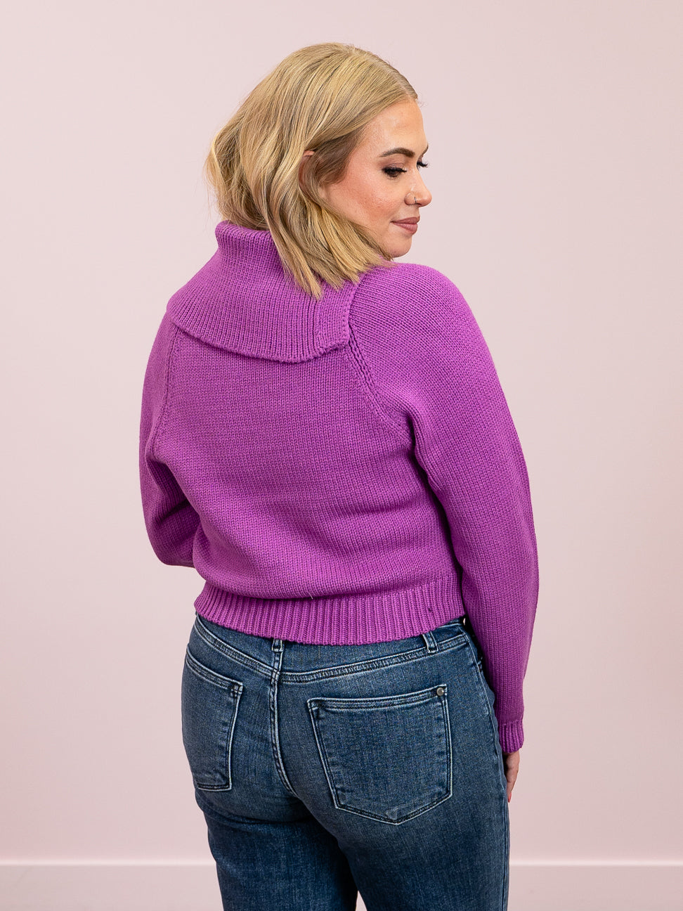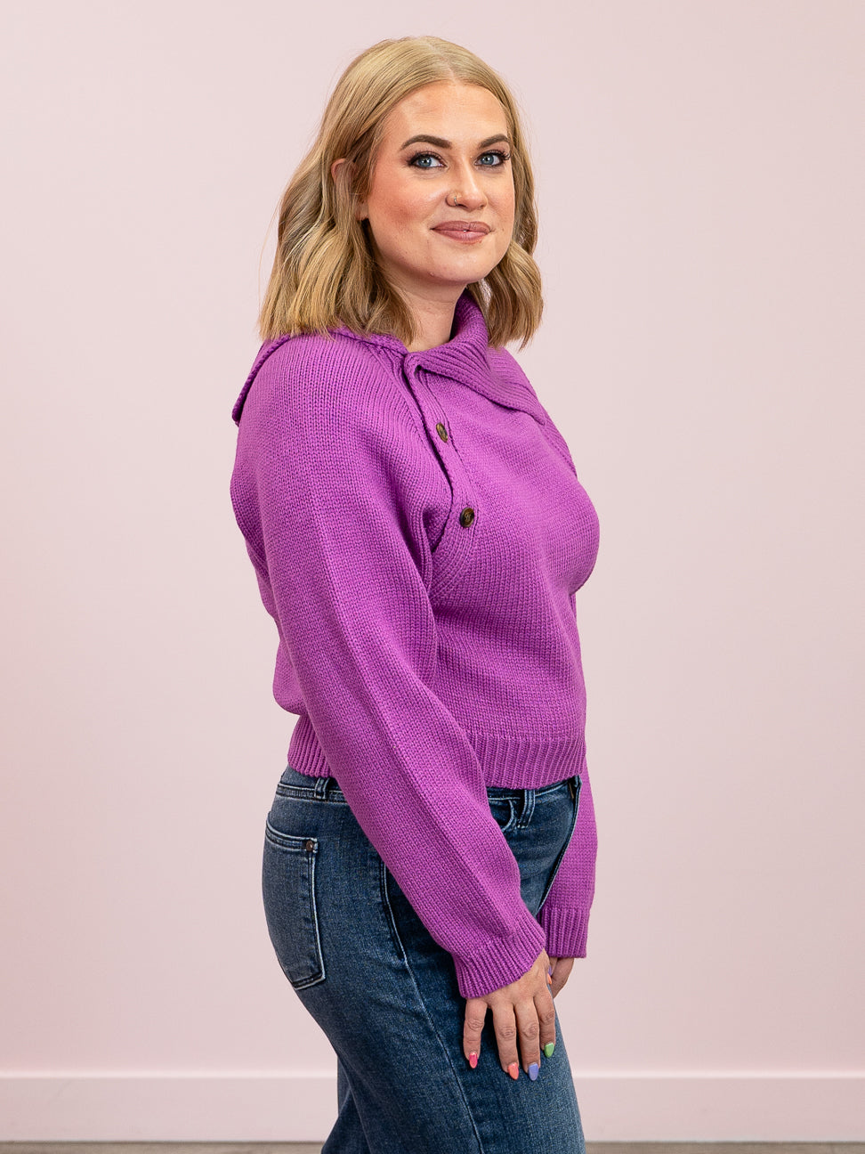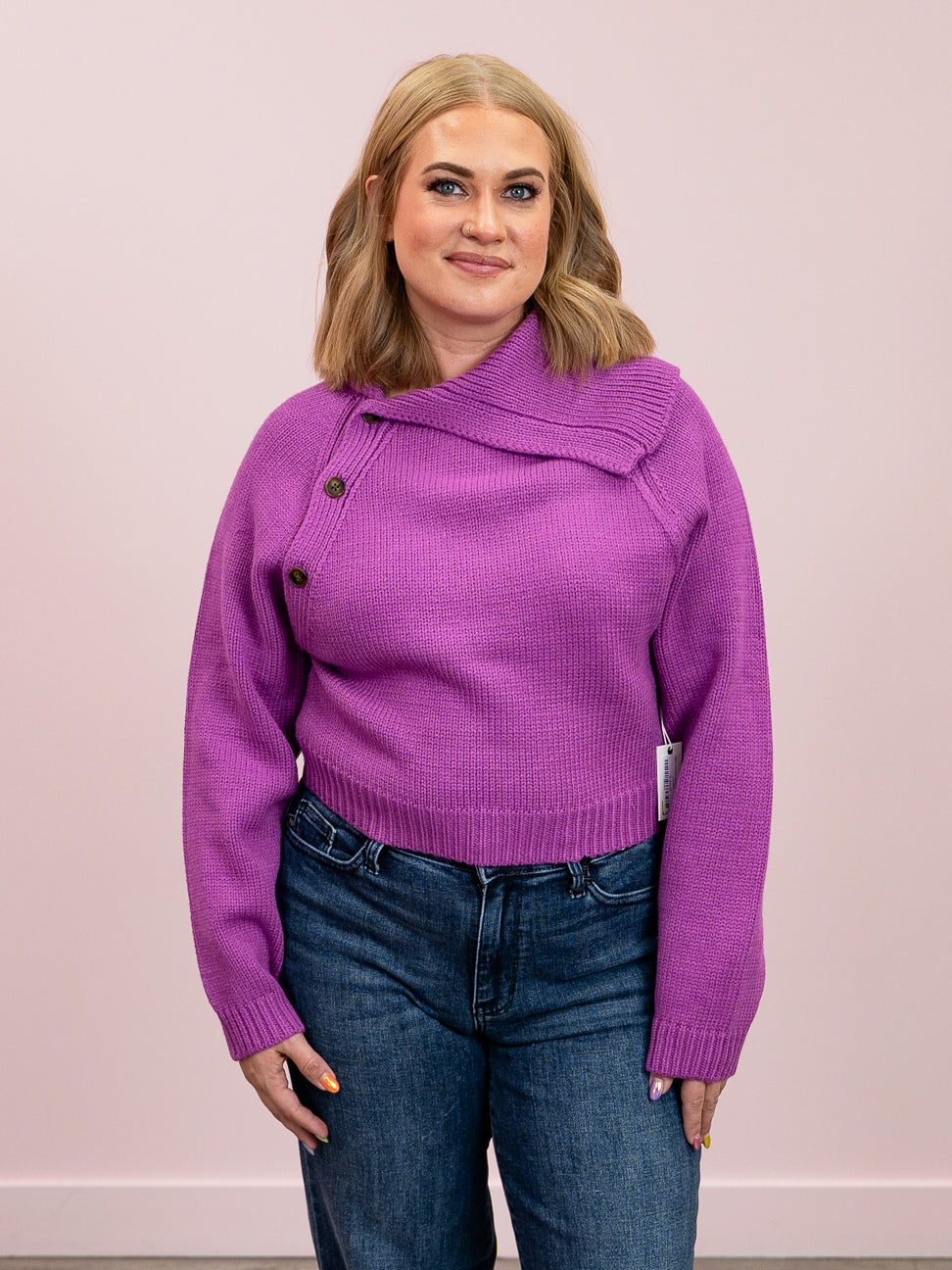 The Samara Sweater features an asymmetrical collared neckline with button detail, long sleeves, and a soft, stretchy knit for all-day comfort with a stylish twist.