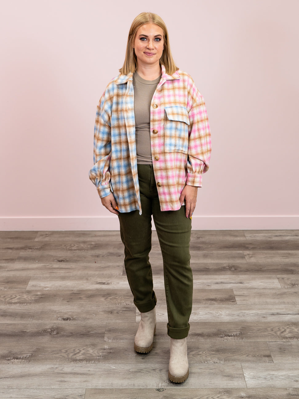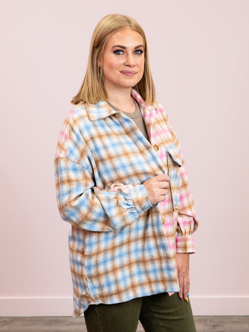 The Alabama Plaid Shacket blends comfort and style with its cozy fleece material and relaxed fit. It features a classic collar, button front closure, a practical chest pocket, and roomy side pockets. Finished with a flattering round hem, it’s the perfect layering piece for cooler days.