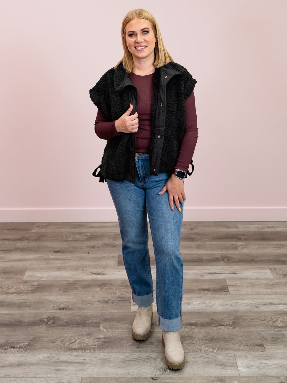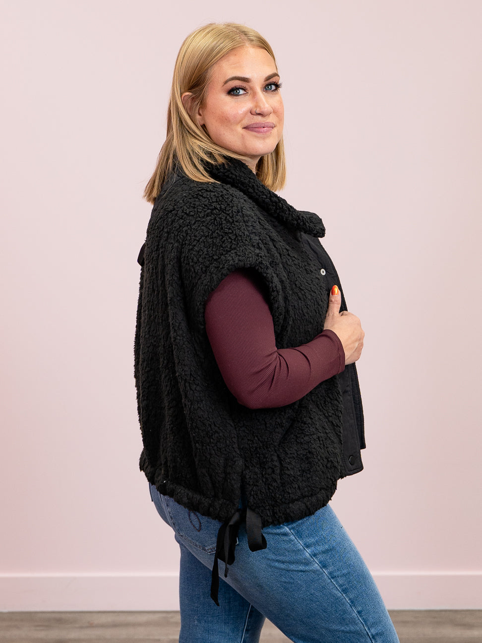 Cozy up in style with the Alaska Vest. Featuring a button-front closure and handy front pockets, this vest combines function and flair. The adjustable tie hem lets you customize your look while the relaxed fit drapes perfectly over any outfit. Made from irresistibly soft fuzzy material, it’s your go-to for warmth and whimsy all season long.