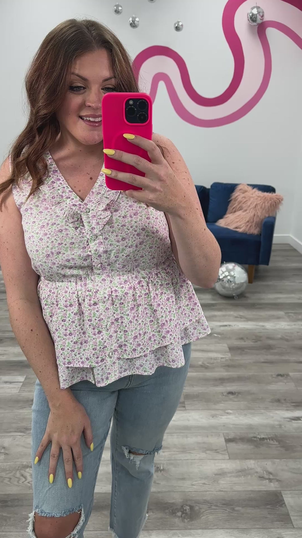 Feminine and flattering, the Among the Wildflowers Tiered Tank features a charming V-neck with ruffle trim, a comfortable elastic waist, and a flowy peplum silhouette. Functional buttons at the chest add detail, while non-functional buttons below keep the look polished. Finished with a tiered design and a dainty floral print, this lightweight blouse is perfect for sunny days.