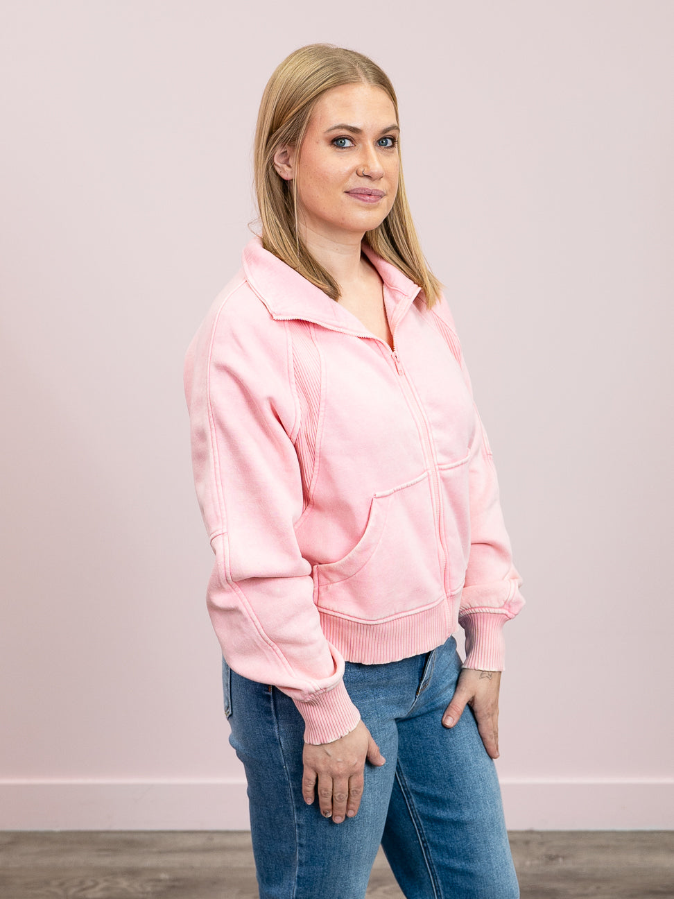 The Ayla Acid Wash Zip Up Fleece is basically a hug you can wear. Slip into its impossibly soft interior and feel the difference quality makes—this is the kind of cozy that makes staying in actually fun. Ribbed texturing adds dimension and keeps everything looking intentional, while the collar gives it that refined edge. Thumbholes are a game-changer for keeping hands warm without bulky gloves, and front pockets mean you've always got a spot for your essentials. Finished in a moody acid wash that's equal parts retro and right-now. Your comfort zone just got an upgrade.