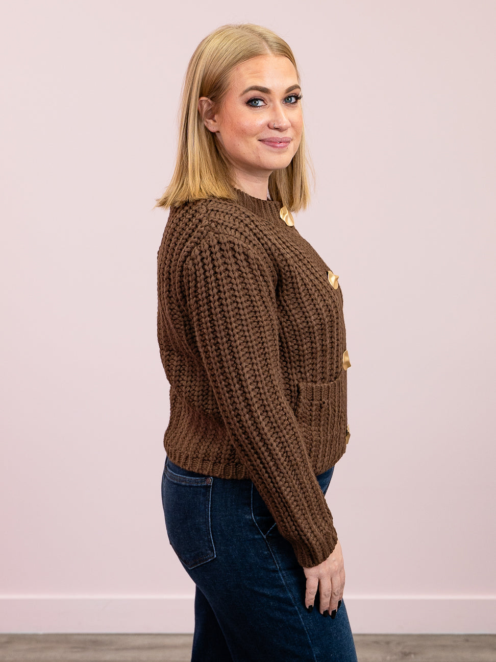 Layer up in cozy charm with the Beatrice Chunky Knit Cardigan. Featuring a classic crew neck, button front closure, and long sleeves, this cardigan blends timeless style with everyday comfort. The chunky knit material adds warmth and texture, while front pockets offer a practical touch.