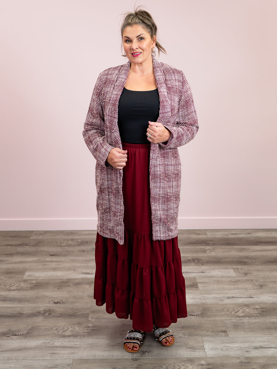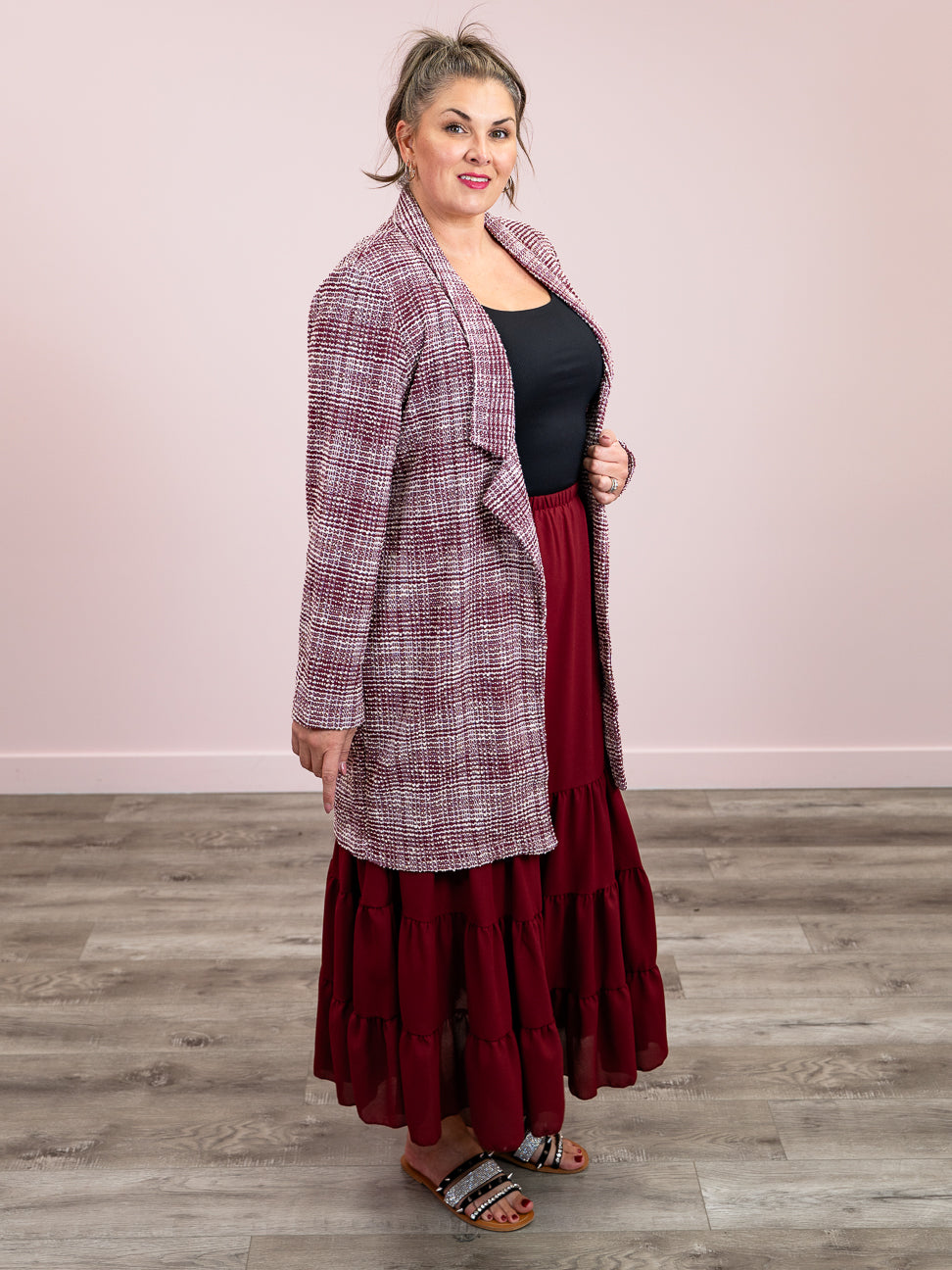 Elevate your wardrobe with this chic tweed midi open front blazer, designed for timeless sophistication and modern flair. Crafted from textured tweed fabric that has a little bit of stretch with a classic blazer silhouette.