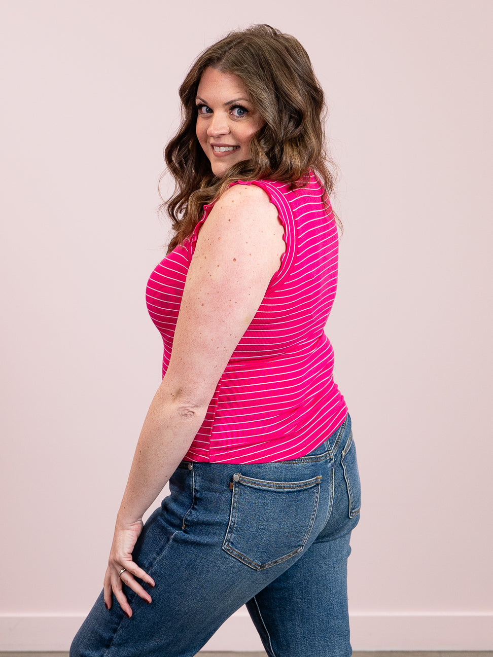*SUNDAY STEAL* Camie Ribbed Ruffle Stripe Tank Top | Hot Pink & White