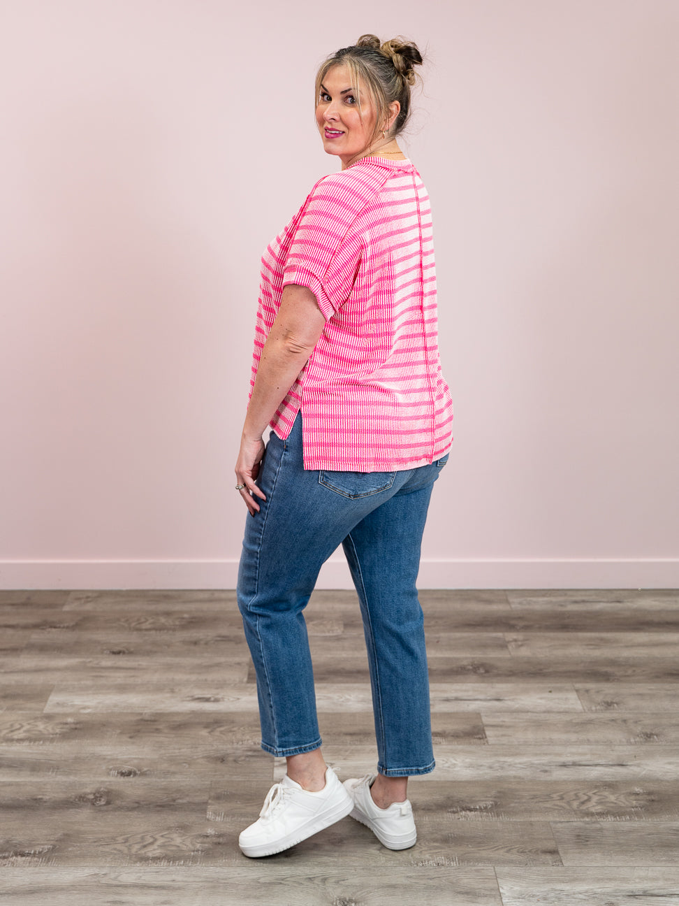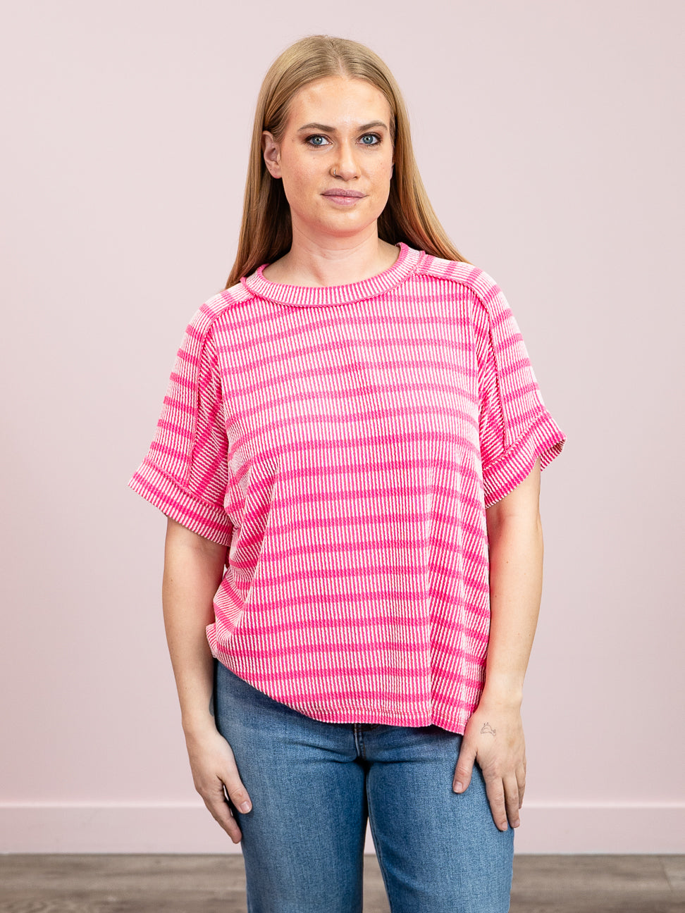 *NEW* Carrina Striped Ribbed Short Sleeve Top | Hot Pink