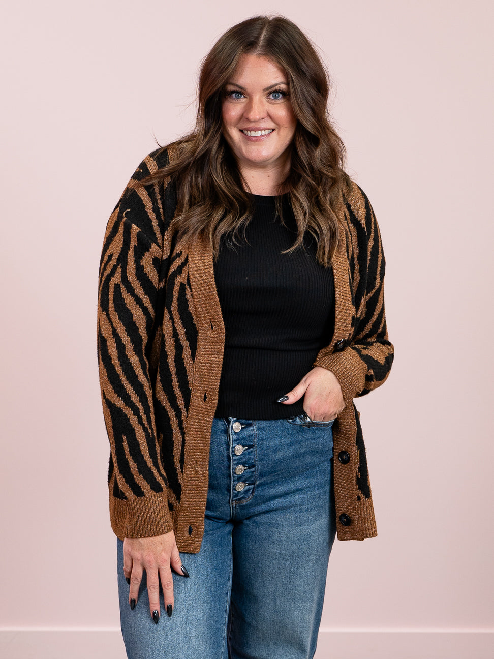 The Vicki Cardigan features a bold tiger print that roars with style. Designed with a relaxed fit and dropped shoulders, it offers cozy comfort for all-day wear. The V-neck and button front closure add a touch of classic charm, while handy pockets and ribbed trim complete the look with practical flair. Perfect for layering, this standout piece brings a fun, wild vibe to any outfit.