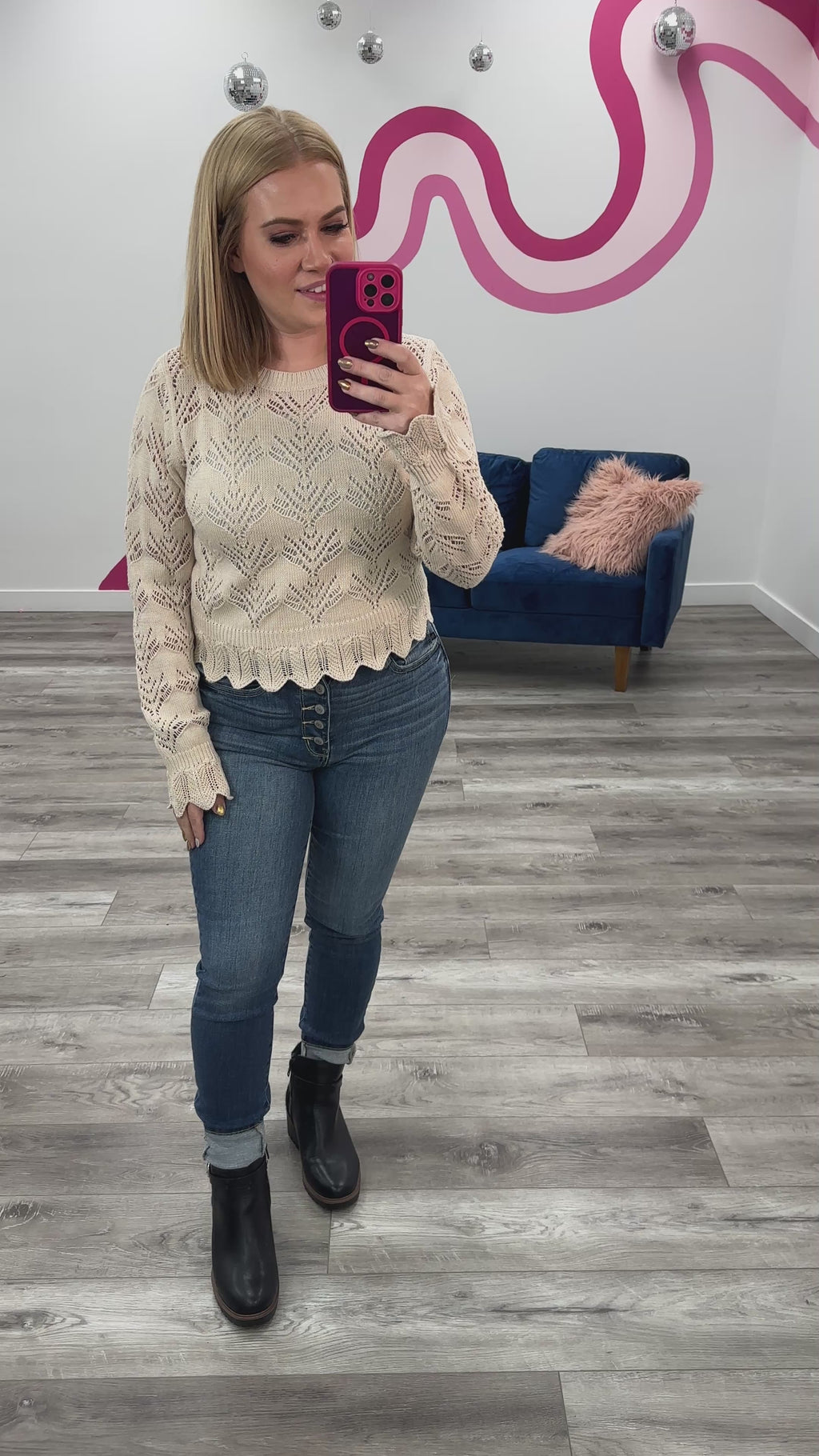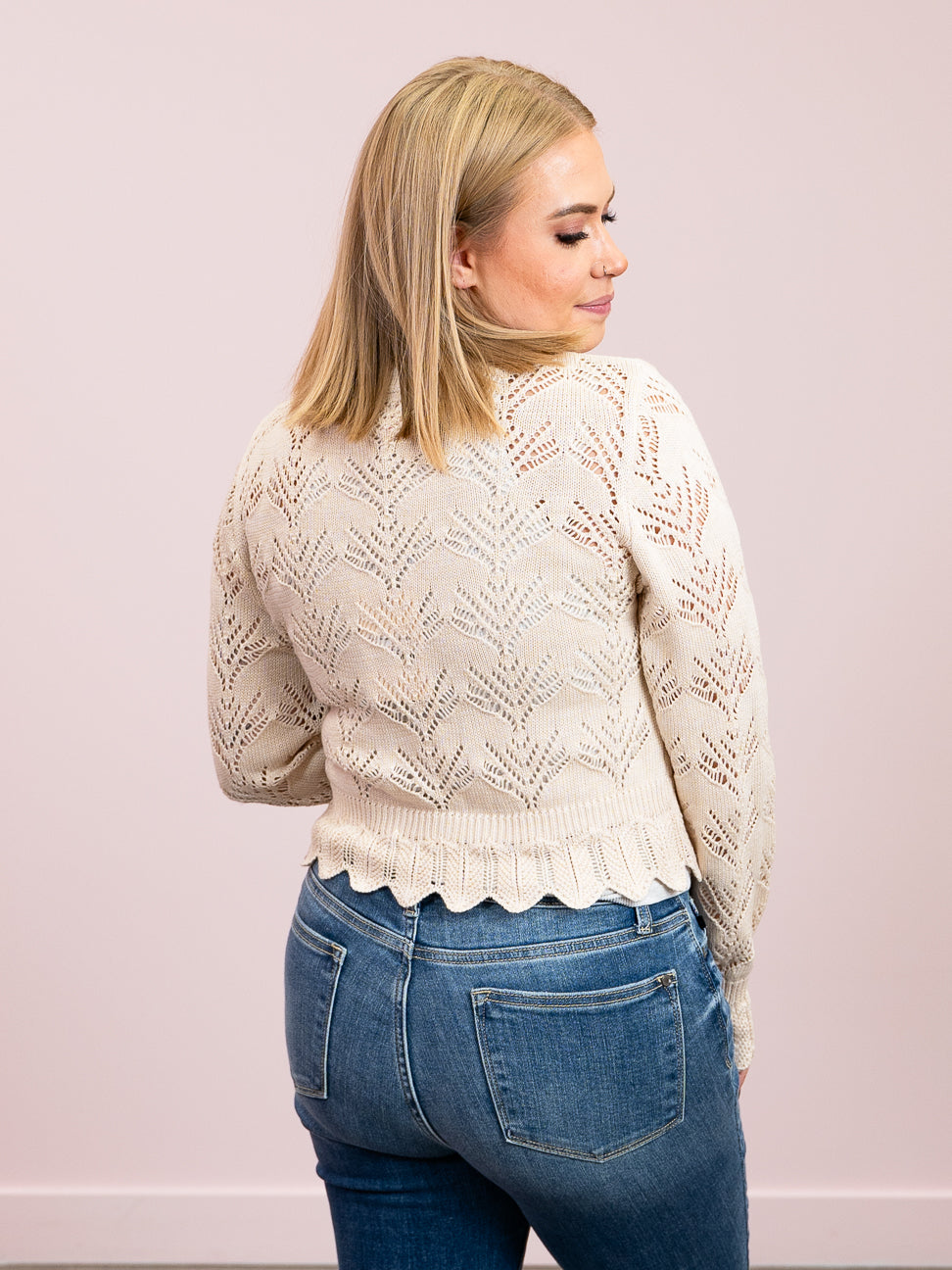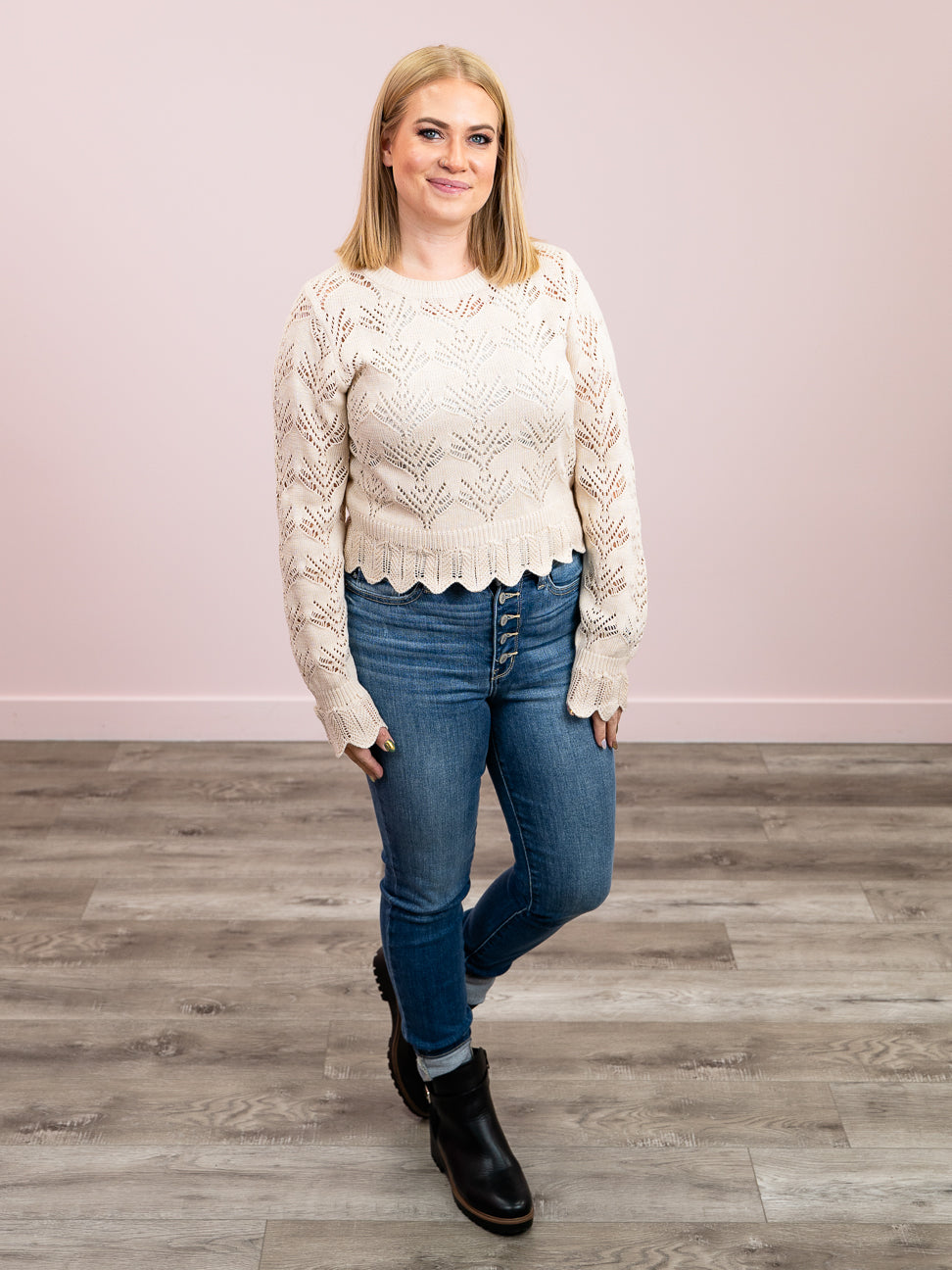 Cozy up in the Dora Pointelle Knit Sweater, designed with a breezy open knit pattern that keeps things light and stylish. Its scalloped hem and cuffs add a charming touch. With a comfy round neck and flattering long sleeves, this sweater is perfect for layering and keeping your look effortlessly stylish.