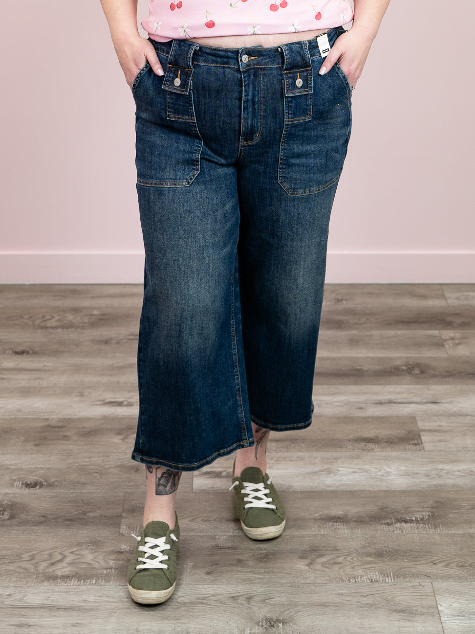 Meet your new denim obsession! These high-rise crop jeans feature a flattering wide leg silhouette and rich dark wash that pairs with everything in your closet. The elevated waistline creates a chic, elongated look, while practical side pockets keep your essentials close. Adorable front button pockets add that perfect vintage-inspired detail. Versatile, comfortable, and undeniably cool—the Jettson is your go-to for effortless style.
