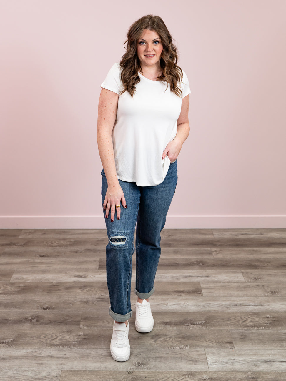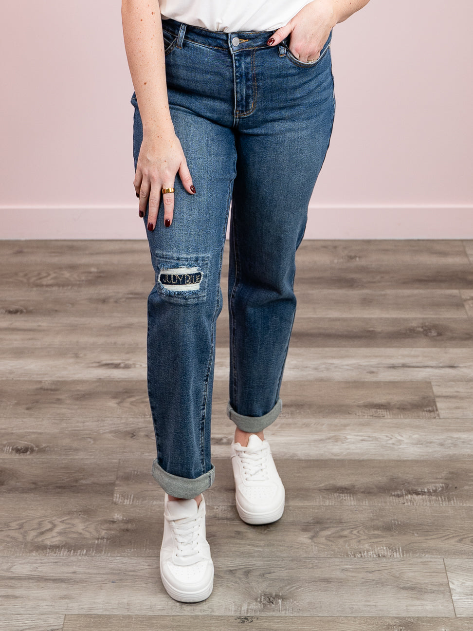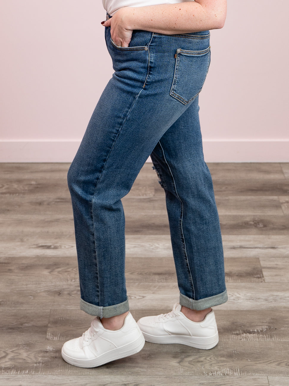 Meet Darryl—the boyfriend jean that actually gets you. This mid-rise stunner rocks a relaxed, slouchy fit that's effortlessly cool, paired with a medium wash that hits that sweet spot between vintage and modern. The single button and zipper closure keeps things simple and chic, while the right knee distressing with signature "JUDY BLUE" stitching adds just the right amount of edge. Throw them on with a crop top or oversized tee and watch the compliments roll in.